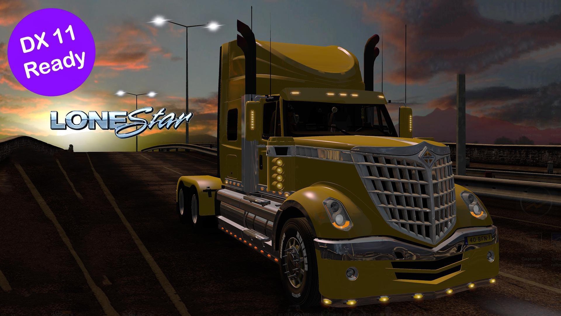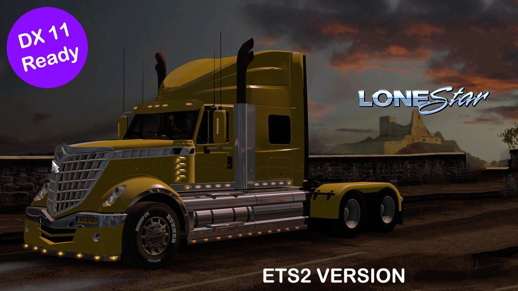 INTERNATIONAL LONESTAR ETS2 1.35.x DX11 Fully standalone. Buy it at BRANDS - INTERNATIONAL dealership. Adaptation to ETS2 1.35.x game version. Totally reworked. Few corrections in 3D model. Added few accessories. Adjusted interior camera position. DLC cabin accessories & SiSL Megapack addon included. You need SiS’L megapack to have all the cabin accessories available. DX11 UPDATE: Fixed crash on DX11 mode. Fixed some textures. Lightened model, improved FPS. Improved Sunshield. Metallic colours & skins don’t supported for the moment (gamelog errors & warnings). Updated wiper modes. Credits: Juan Bautista Rosario Jr, CTV, DaD |