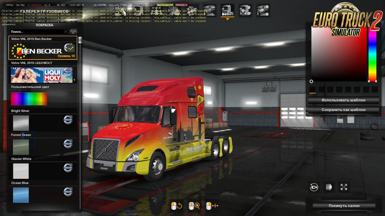 - Standalone; - Find in Volvo - 3 cabins; - 6 chassis; - 16 engines; - 10 transmissions; - 4 interiors; - Tuning; - Accessories in the cab; - Its sounds. New Changes in 2.20: -Dealer registration files and agency orders fixed to ensure compatibility with other mods -Improved lights at the rear of the cab -Chromed air intake is removable -Part of the bumper has become removable -Added paint and plastic options for the bumper Changes in 2.19: -Updated engines and gearboxes -New Cummins X15 sounds -Removable kenguryatnik -Removable grill -Added paint and plastic options for kenguryatnik -Added paint and plastic options for the front grille -You need to buy a checkpoint and a kenguryatnik again Changes in 2.18: -Adaptation for 1.35 -Error correction Changelog v2.17: -Added Realistic Headlight Beam Pattern by hastantyo -Changed location on the template for Flow below parts -Improved the look of blinker indicators on mirrors -Added collision boxes for main mirrors -Added collision boxes for hood mirrors -Added collision boxes for bullbars -Adjusted mirror locators for even view -Improved the logo on the steering wheel -Improved startup animation -Updated shift points Credits: Authors: SCS, franck_peru, yekko-yek Update: galimim Adaptation in ETS2: modsets Tested on 1.35.x game version Credits: Franck_peru, Yekko-yek, galimim |