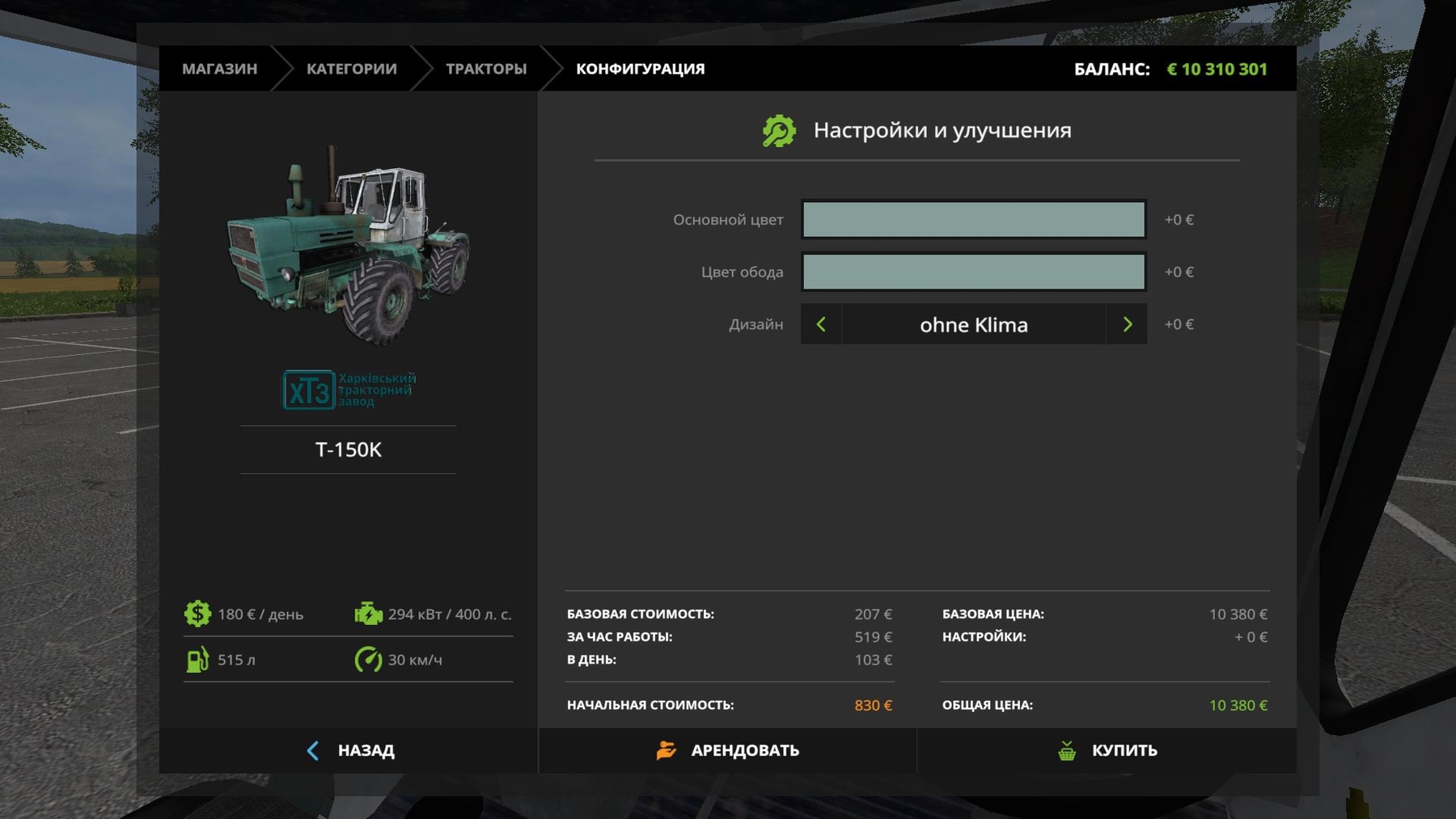 Hir mal the little brother of K700 Is still a beta Authors: Norton / PavelVakulov / 36region / ANDREI1994 / Rsonic30 (So that the mods klauer also have to do and work our work further) T-150K is an oldfashioned russian tractor. It was used to transport rocket for the russian army. But with its 220 hp the Kirovets K-700A is also a famous farming tractor. Price: 10380 € Max. power: 400 hp Max. speed: 30 kph Maintenance: 180 € / day. Credits: - |