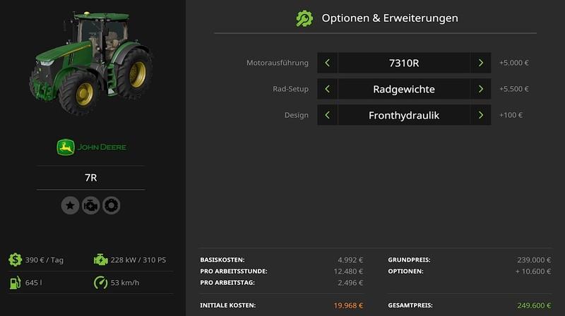 JOHN DEERE 7R V1 John Deere 7R 2 Motor configurations IC control Scripts for tire pressure Animated indoor hud via script It is not allowed to upload or spread again!