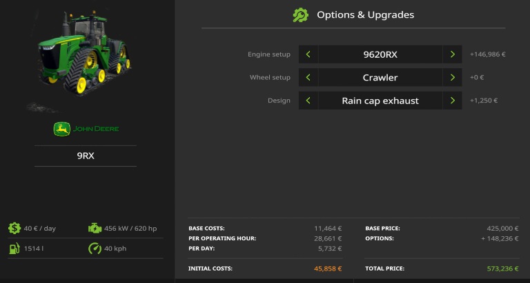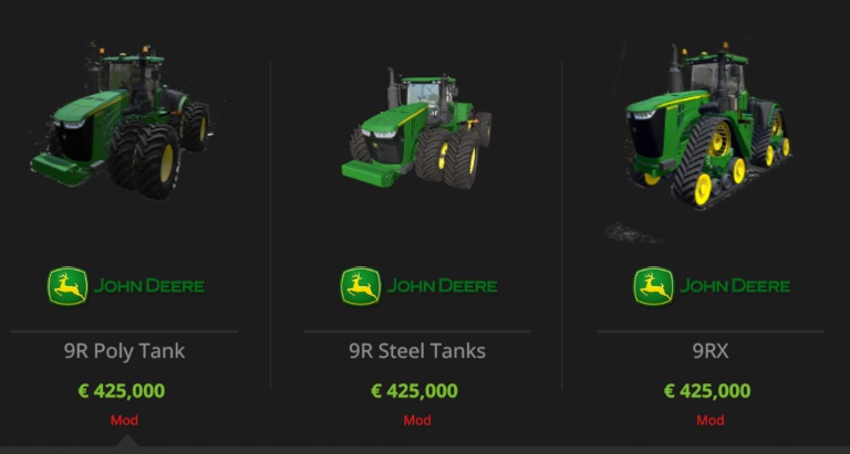 JOHN DEERE 9R/9RX SERIES Pack Mods are ment to be free 1. 9RX Price: 425000 Power: 536 2. 9R Poly Tank Power 536 Maximum Speed: 40