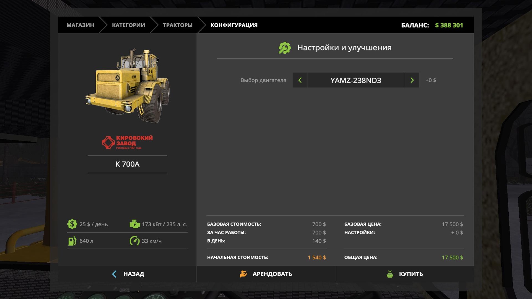Price 17500 Service 25 Capacity 235 hp Speed 33 km / h Buck 640 l