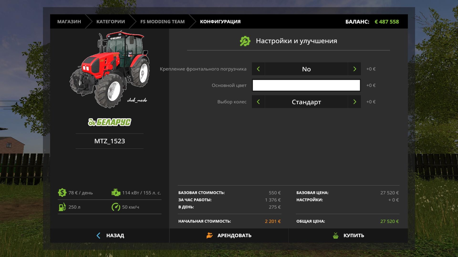 Also selected are the wheels, body color, IC control. Open the doors and windows, lower the sun visor - on MTZ-1523 it is done in two counts.