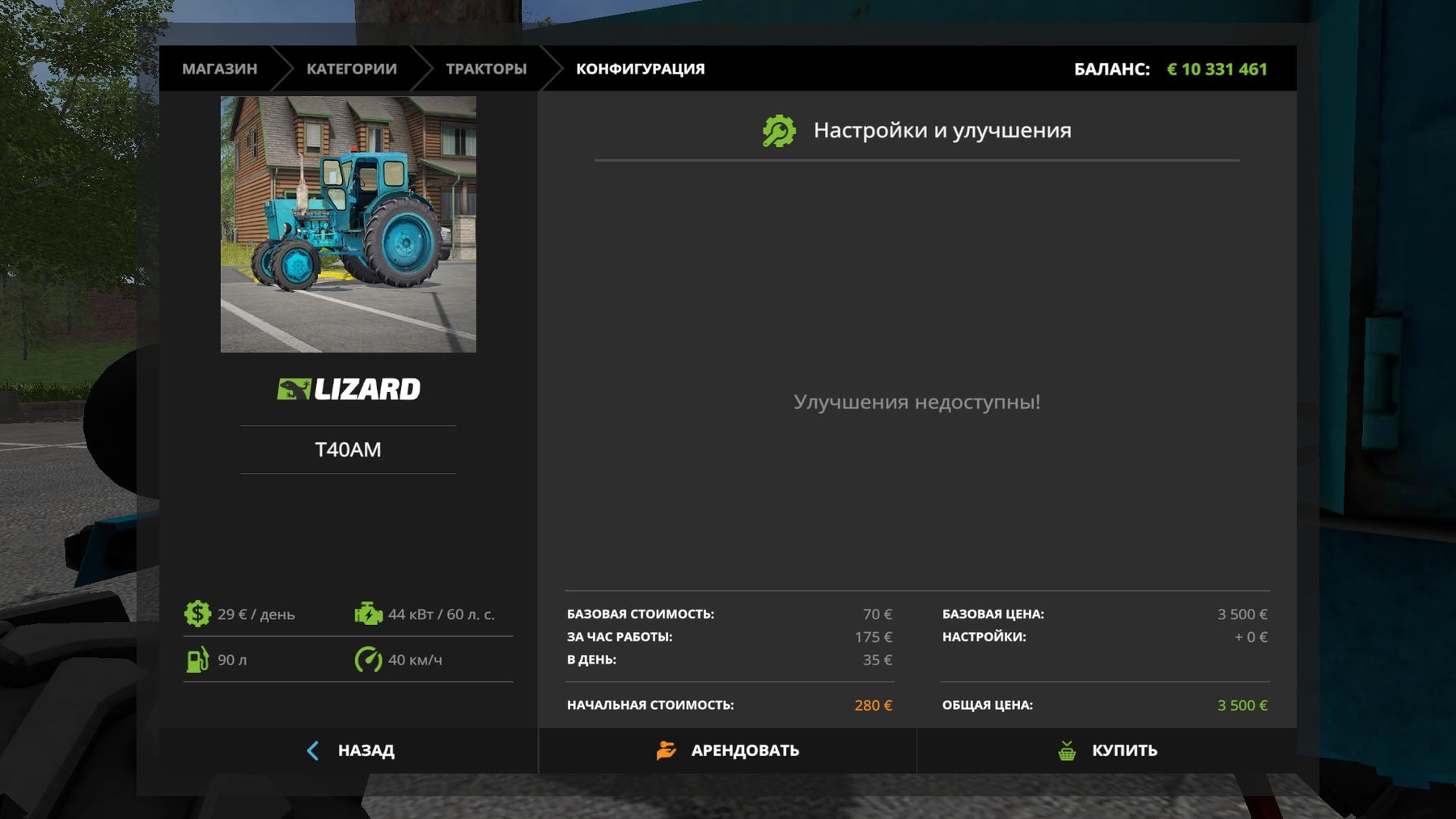 Tractor T-40 AM, it is also the "Sorokovka". It is this tractor that you can add to the game Farming Simulator 2017 by installing this mod. Characteristics: The cost of the tractor in the game: $ 3500, and for service will have to pay $ 29 per day. Authors: Max1985, Tornado, Nickel77, LSSA, Clondike, Mtz-2l, ANDREI1994, TeoR | Conver Martynas Credits: --- |