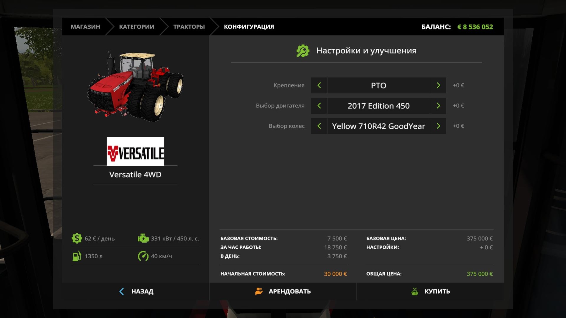 The cost of the tractor in the game, €: 375000 Tractor maintenance, € / day: 62 Engine power, hp: 450 The volume of the fuel tank, l: 1350