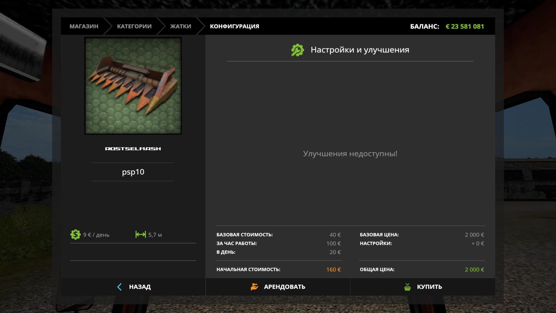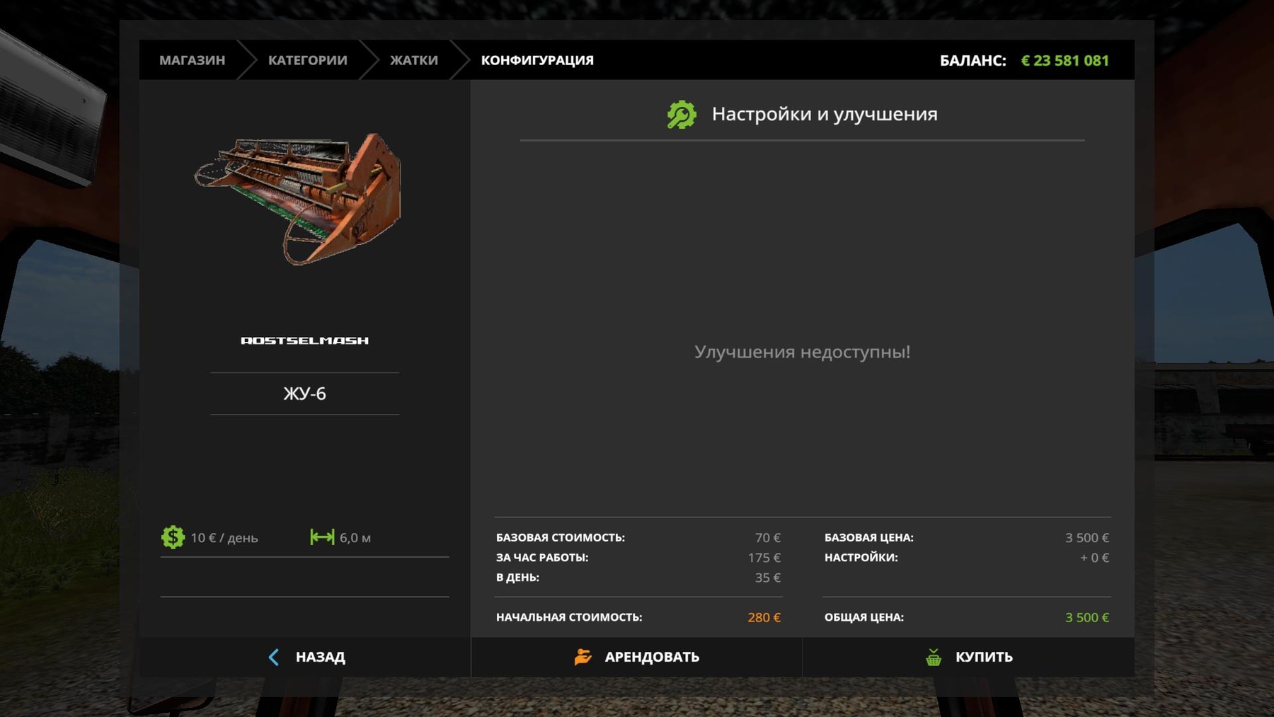 Added different sounds Price 15000 Service 50 Capacity 235 hp Speed 33 km / h Tank 540 l Includes two reapers 1) ZHU-6 width of 6 m 2) PSP width 5.7 m Credits: Chernikoff den2382 |