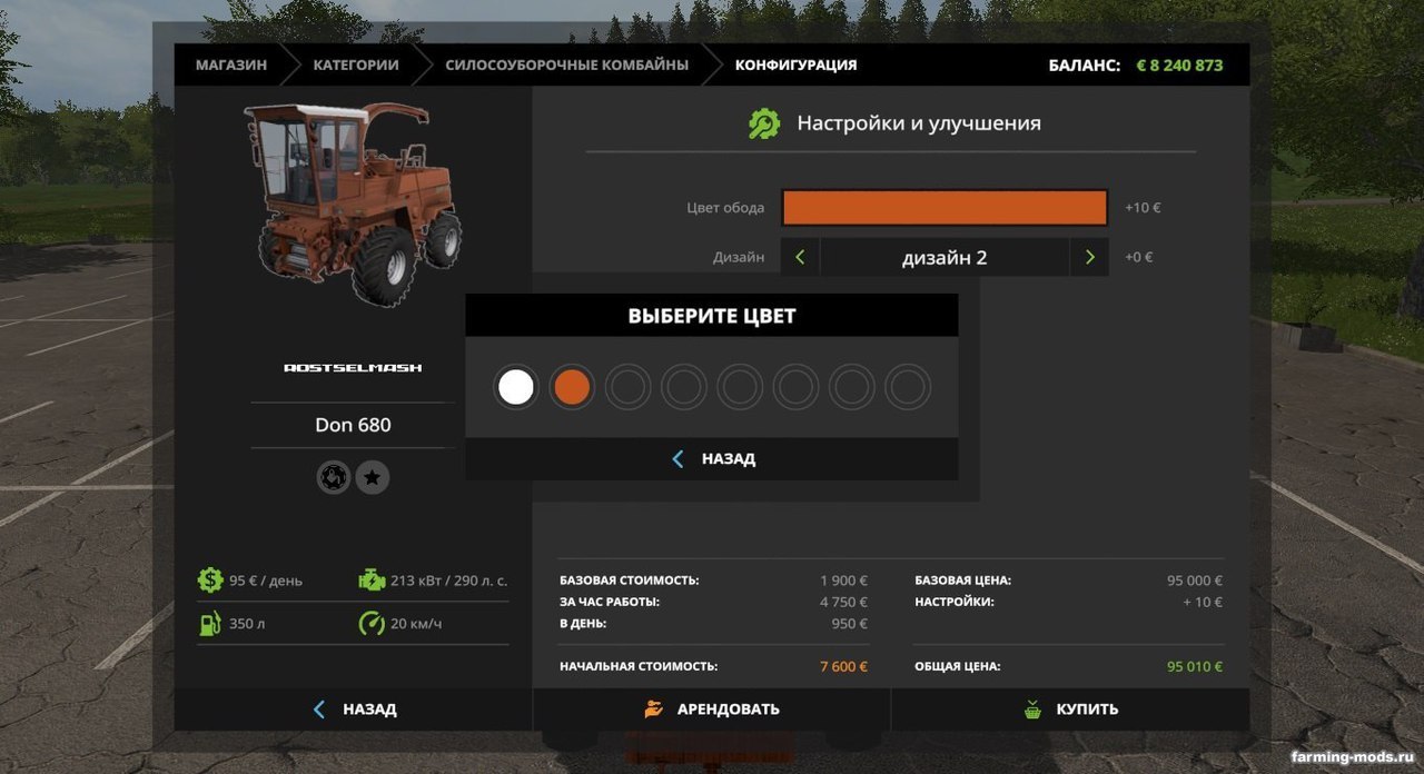Don 680 in Farming Simulator 17 has a capacity of 290 hp. Max. freight speed - 20 km / h. All standardized functions. Remember to design and color the wheels of the wheels, the deformation of the tire, the moisture. In the package, it is possible to buy: for a low-fat culture - RNM 100.70 with a sharp 4.95 meter, for a corn header - 3500 horsepower in 3.5 meter, and a picker roller (+ can be used to pick the steam). Credits: Shnurok |