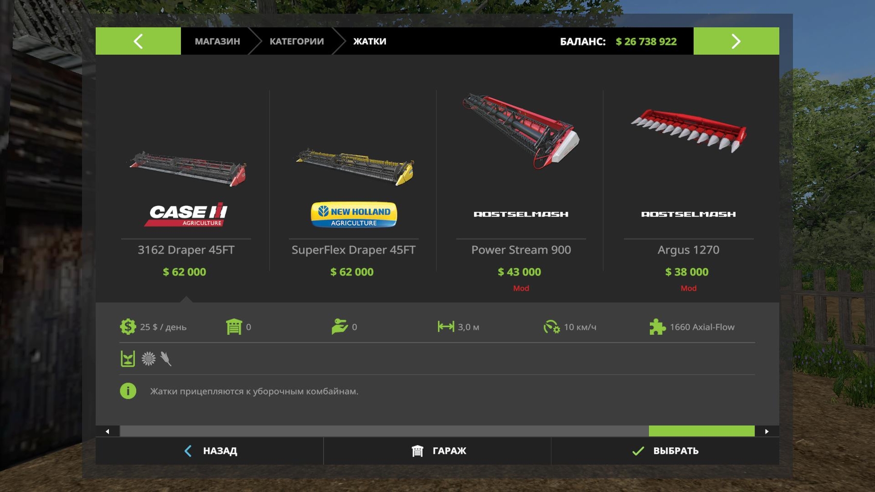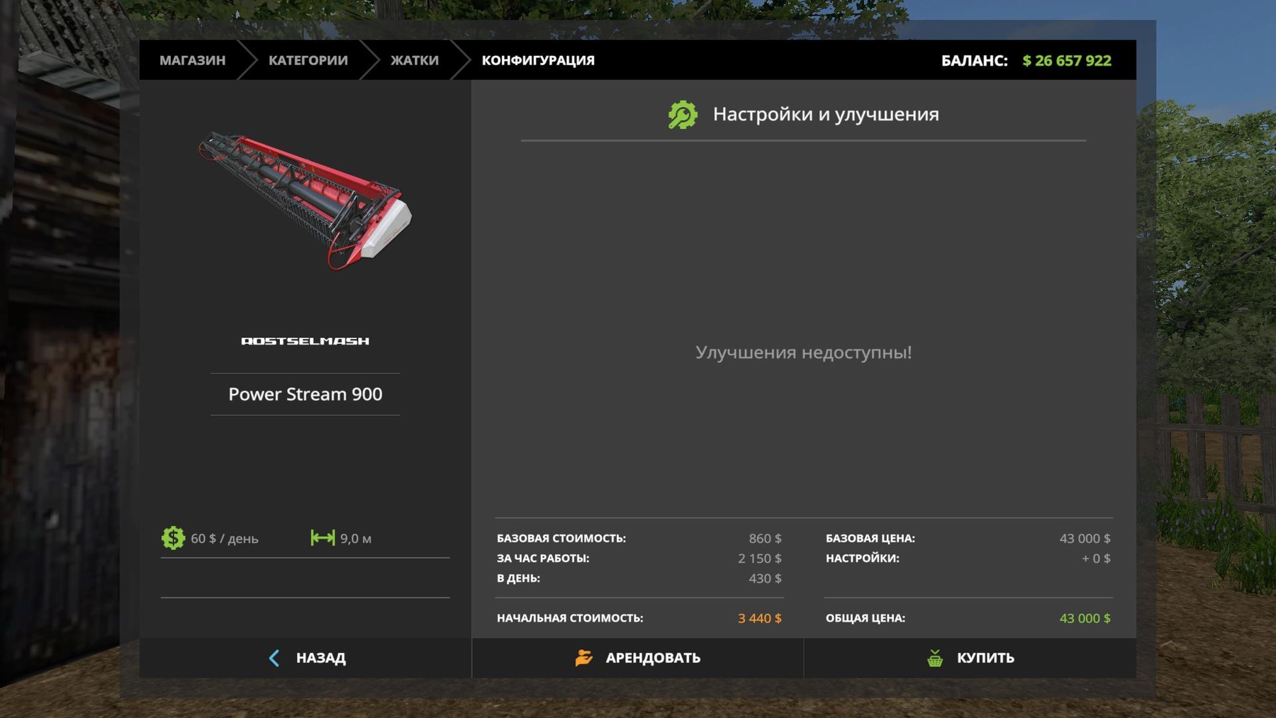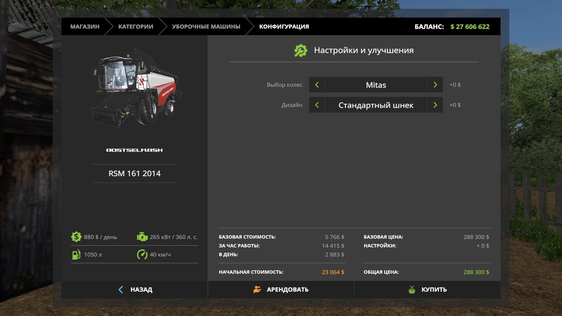 The volume of the bunker is 10500 liters Go to it, two grain and power header Price 288300 Credits: Shnurok, GIANTS Software |