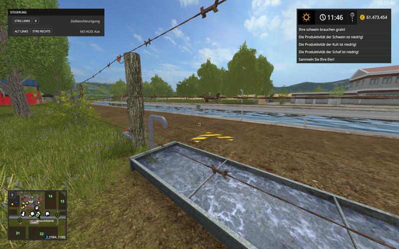 All animals (chickens, pigs, cows and sheep) are deviating from the old version of the LS 15 now directly on the farm and can be supplied there. On the farm there are separate silos for Gtreidesorten, a camp for potatoes and sugar beet, a camp for straw, grass and hay sowei a camp for silage and chopped. The Abkipporte and Entnhamen are clearly visible. In addition, is still a stock for crap installed that can be taken, however, only with normal followers again. Unfortunately Miststreuer not load this directly from the warehouse, which is due to the scatterers, I can not change now. On the farm (hydrant) and behind the farm (well), there are also water. In addition to one of the barns, the shelf for big packs is set, but there is also a small cottage for seed and spreading fertilizer, where the equipment can be filled directly. Fertilizer spraying can not loaded there.