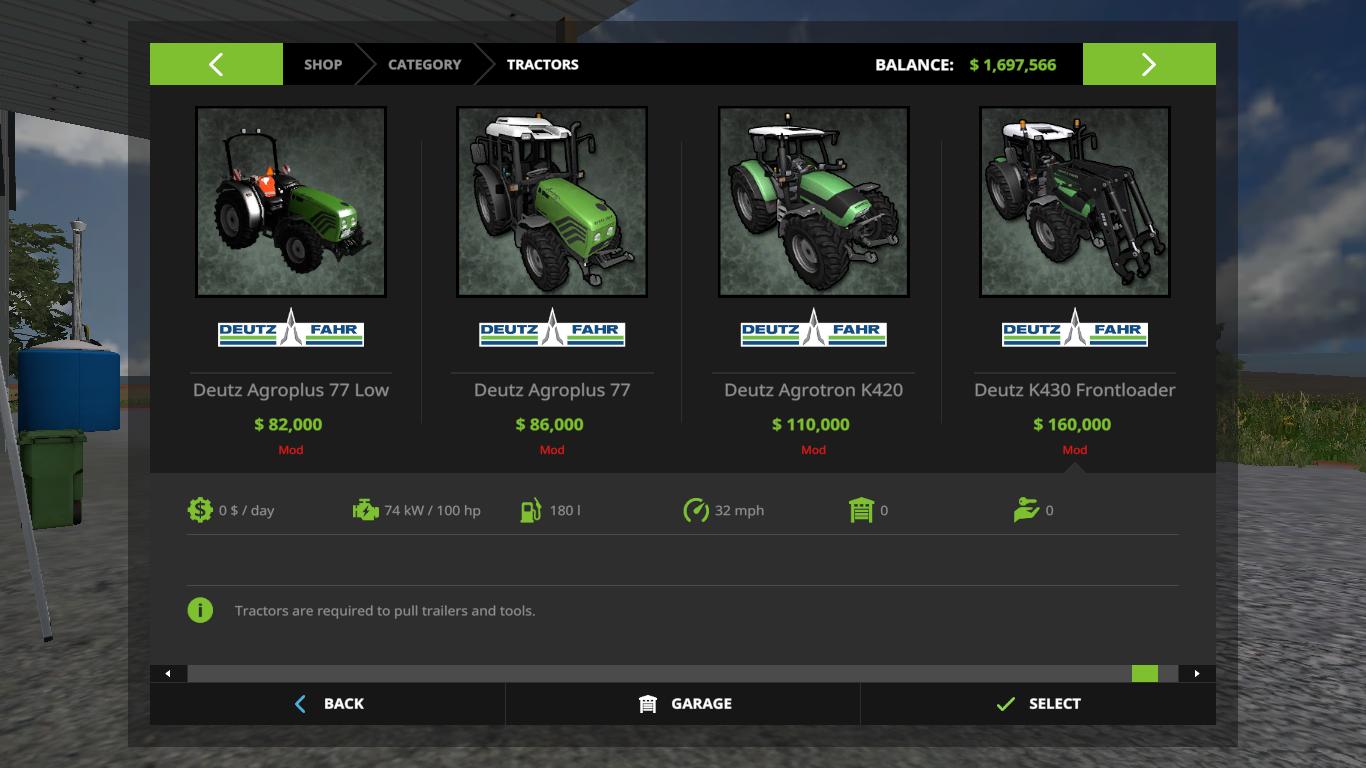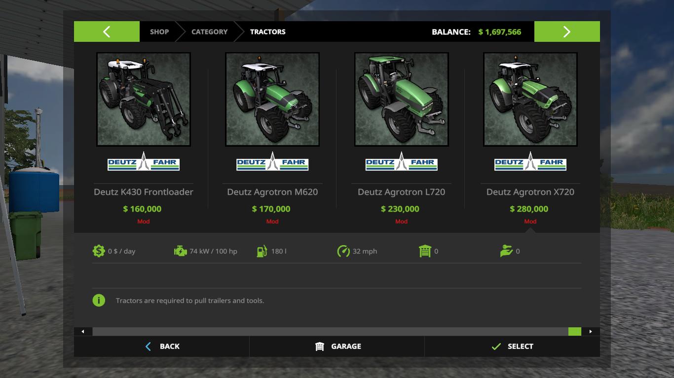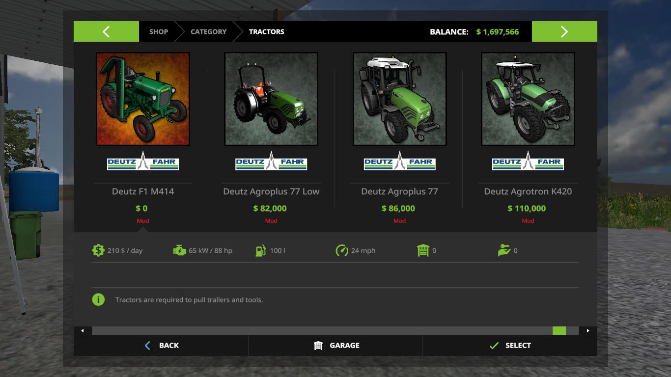 Here is the original Deutz Fahr technique from Farming Simulator 2011 and 2013, converted into Farming Simulator 17 In the bag you will find 3 combines, a telescopic loader with an exciter, 8 tractors and 4 reapers. Credits: Giants/Serge44/Hugo94FR |