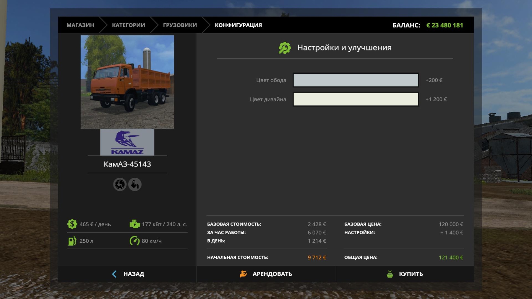 There is a choice of rim color and design (primary color). When you press the Z key, the body changes to a silo and vice versa. Volume: 15,200 / 27,000 liters. Cost: 120000 Speed: 80 km / h. Transport all standard goods. The log is clean.