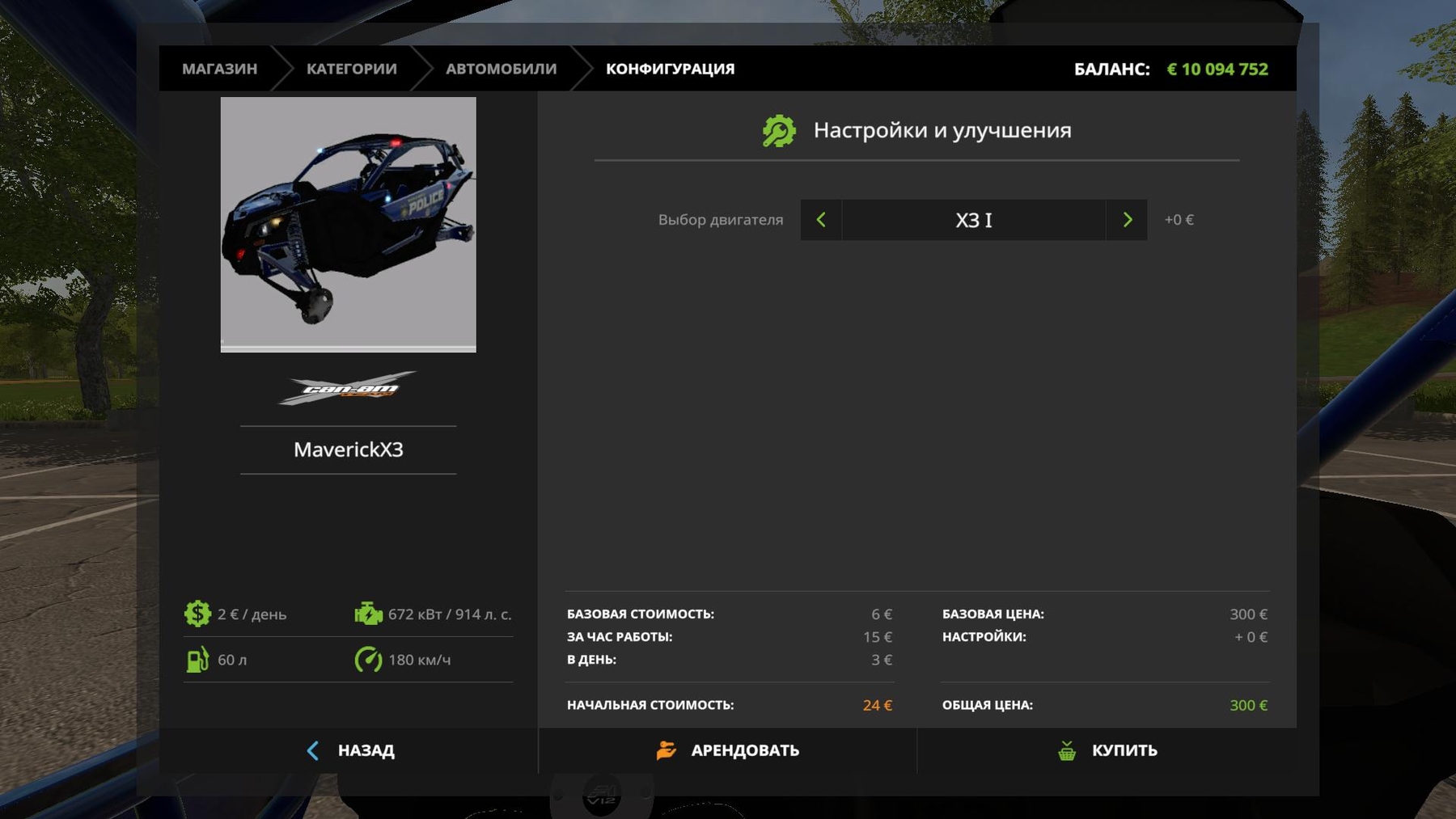 Hey cops and robbers was fun! Hope you enjoy Added Lights and sirens Price: 890 € Max. power: 914 hp Max. speed: 185 kph Maintenance: 30 € / day three engines engine: MaverickX3 100hp speed 120km/h engine: X3 II 120hp speed 150km/h engine: X3Wild 150hp speed 180 km/h price 3000 dailyUpkeep 122 lifetime 600 deluxe!