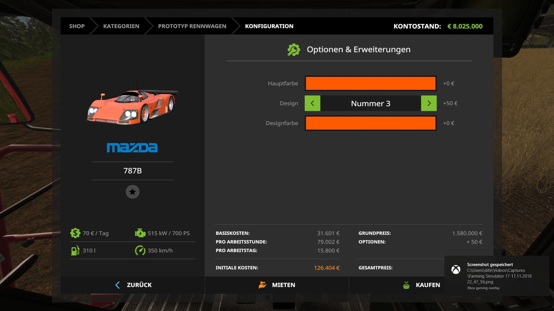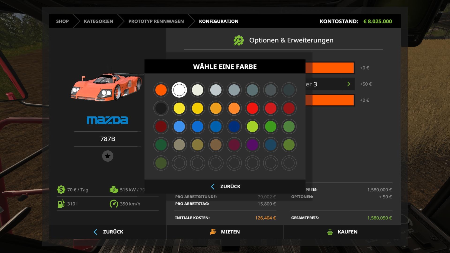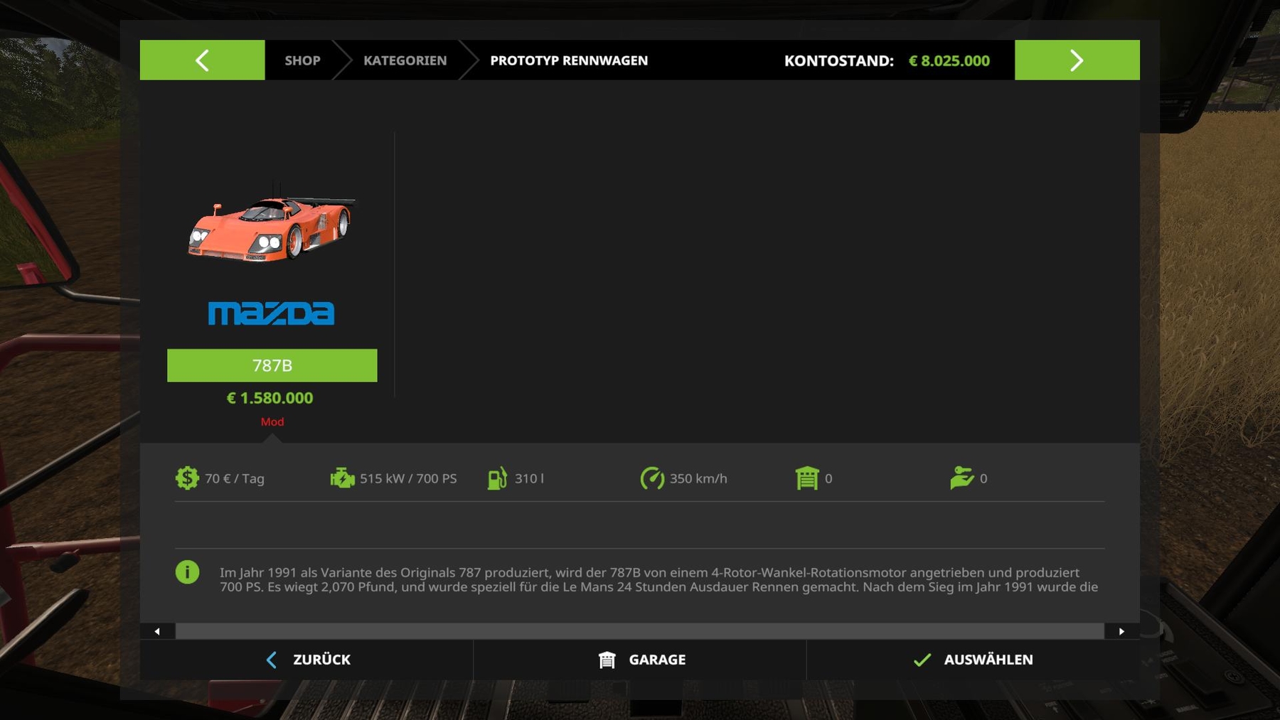Produced in 1991 as a variant of the original 787, 787B is equipped with a 4-rotor Wankel rotary engine producing 700 hp. It weighs 2,070 pounds, and was specifically designed for the Le Mans 24-hour survival race. After his victory in 1991, the 787B was fired after the FIA outlawed rotary engines, while the other 2 derivatives continued to be used for racing purposes. Credits: GIANTS Software/Melkorius |
