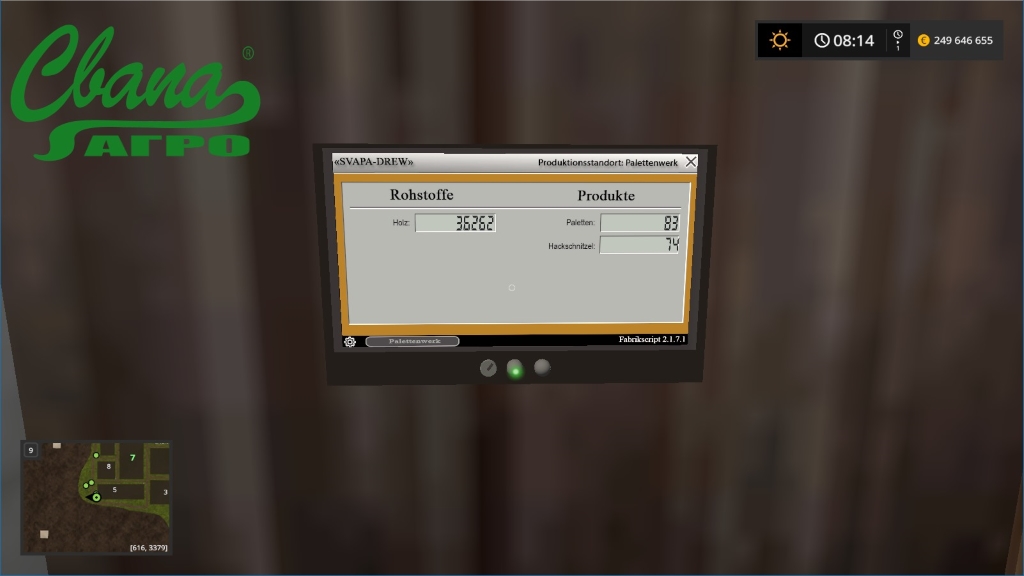 First mod of the line "Production mods "of the Svapa Agro"". Factory pallets. To work factory pallets will need the following resources: 1. Tree. Production: Empty pallets and sawdust. Pallets you can sell at the point of sale of pallets (included in Mod) or to use in our mod from the production line. In version 1.0.5 the new category "Svapa Agro Production", which are now found in all of our facilities. Also added a new brand "Svapa" The mod is compatible 100% with all of our mods. Verified to work on the standard maps FS17. Compatibility with other mods will be checked periodically. FORBIDDEN: changes and additions in this mod. Posting on other sites is possible only with the permission of the authors and only with the original download links and original screenshots. Support and discussion of our mods is on the website www.mods-community.de. Official group Vkontakte - https://vk.com/public143011513 , Odnoklassniki - https://ok.ru/fs2017 Thank you marhu and kevik98 for scripts, joachim for the help in testing. SPECIAL THANKS Blacksheep-RC-Devil for help and advice. Credits: Svapa Agro |