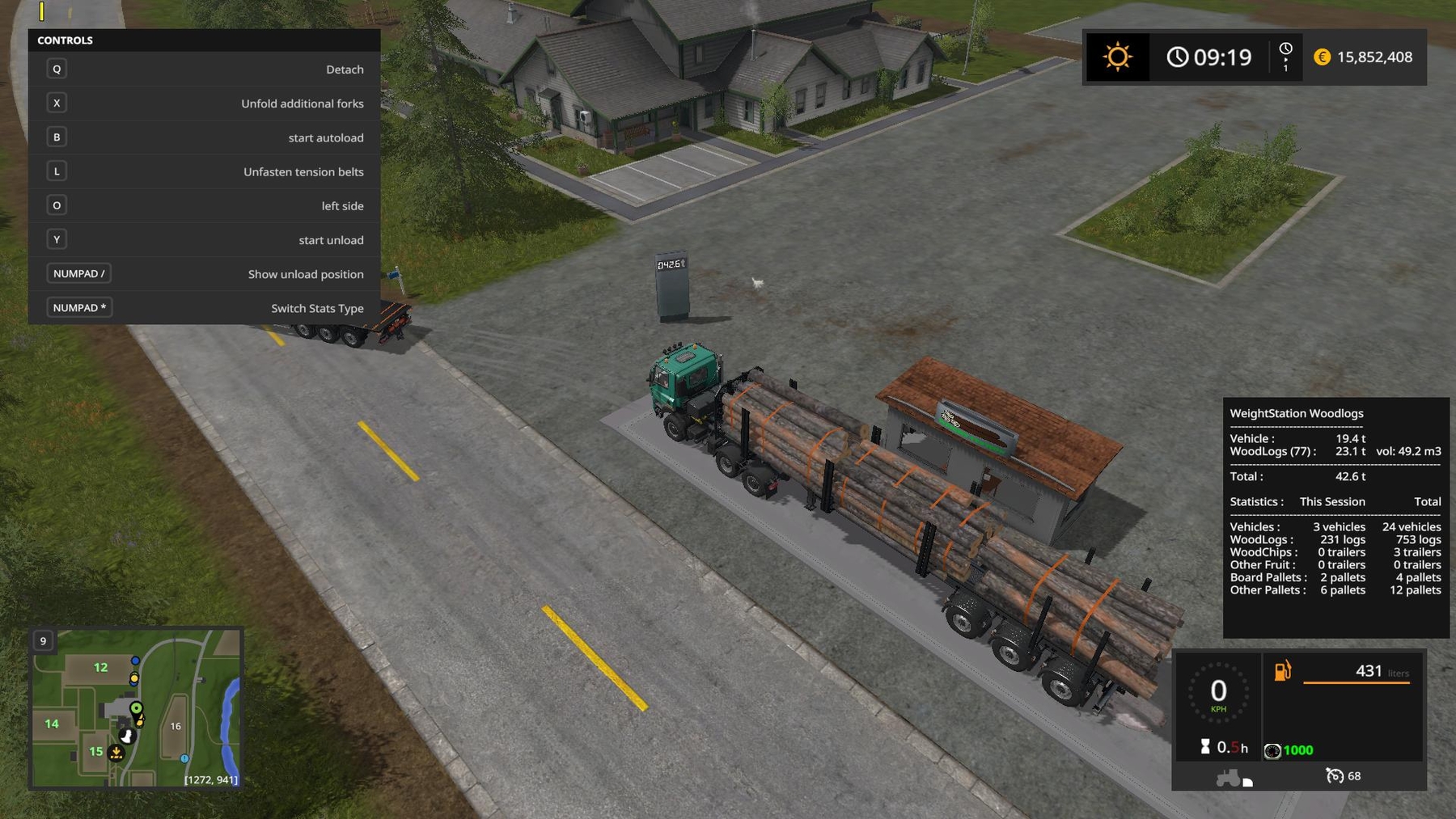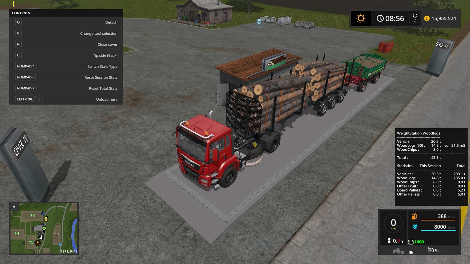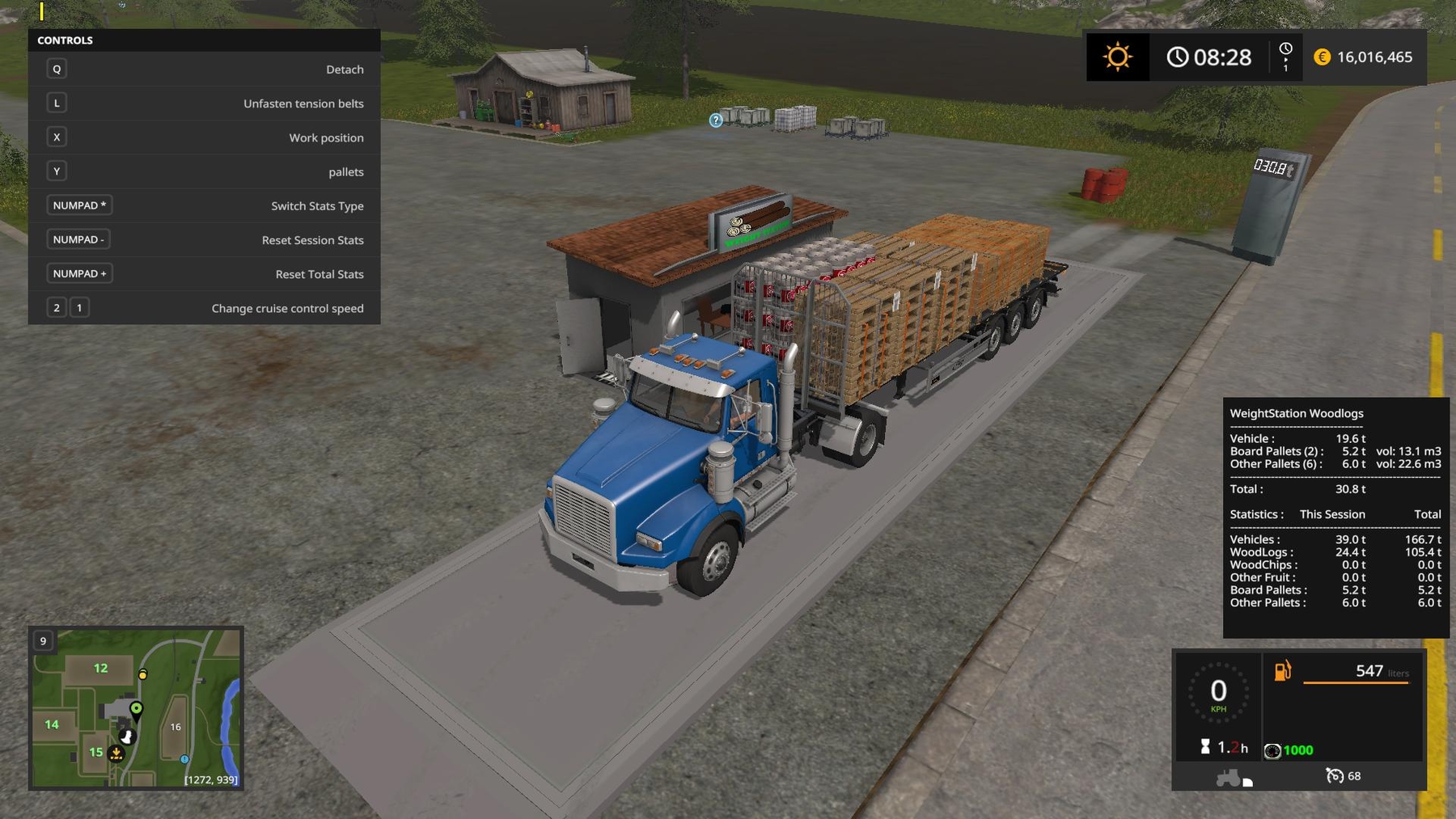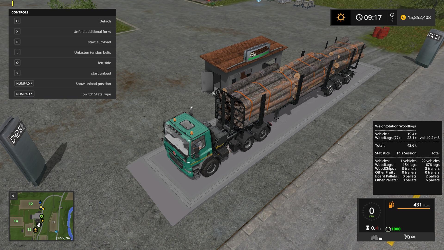 Weight Station For Wood Logs Placeable v1.0 for Farming Simulator 17 This Weight Station shows you weight of wood logs, woodchips, wooden boardpallets, other pallets and other fruit. -two animated displays for showing total weight -also shows volume of logs and pallets -shows total statistics and statistics for current session (last savegame) -total statistics are saved to the savegame -you can reset session / total stats with KEY_KP_minus / KEY_KP_plus -you can switch statistics type (showing total weight for each category or showing number of logs, pallets, trailers..) by pressing KEY_KP_multiply -mod is placeable If you find any errors or issues, let me know in comments or to kenny456@seznam.cz and i will fix it in next version. Credits: kenny456 |