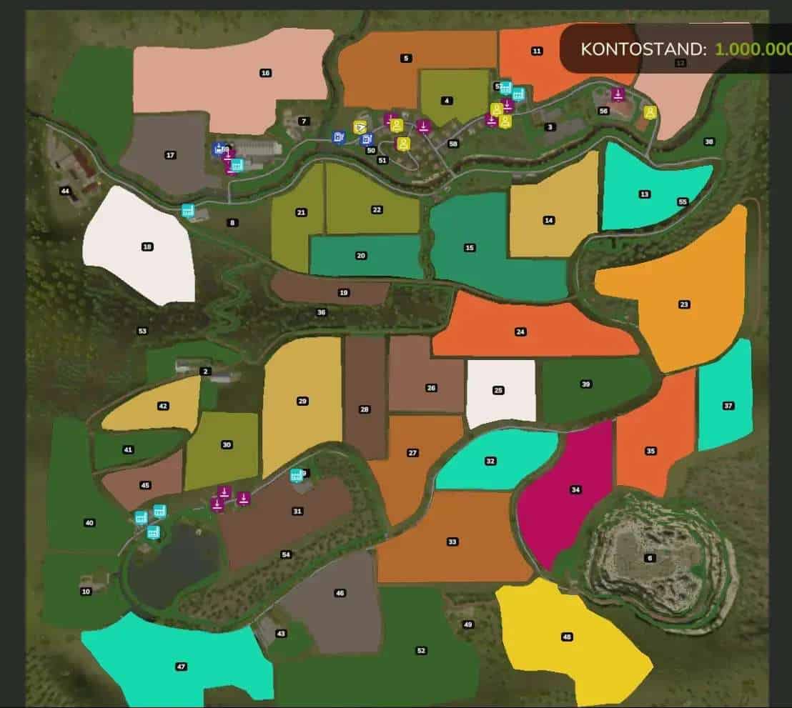 There are 38 medium-sized fields, 4 forests. There is a vegan meat production.