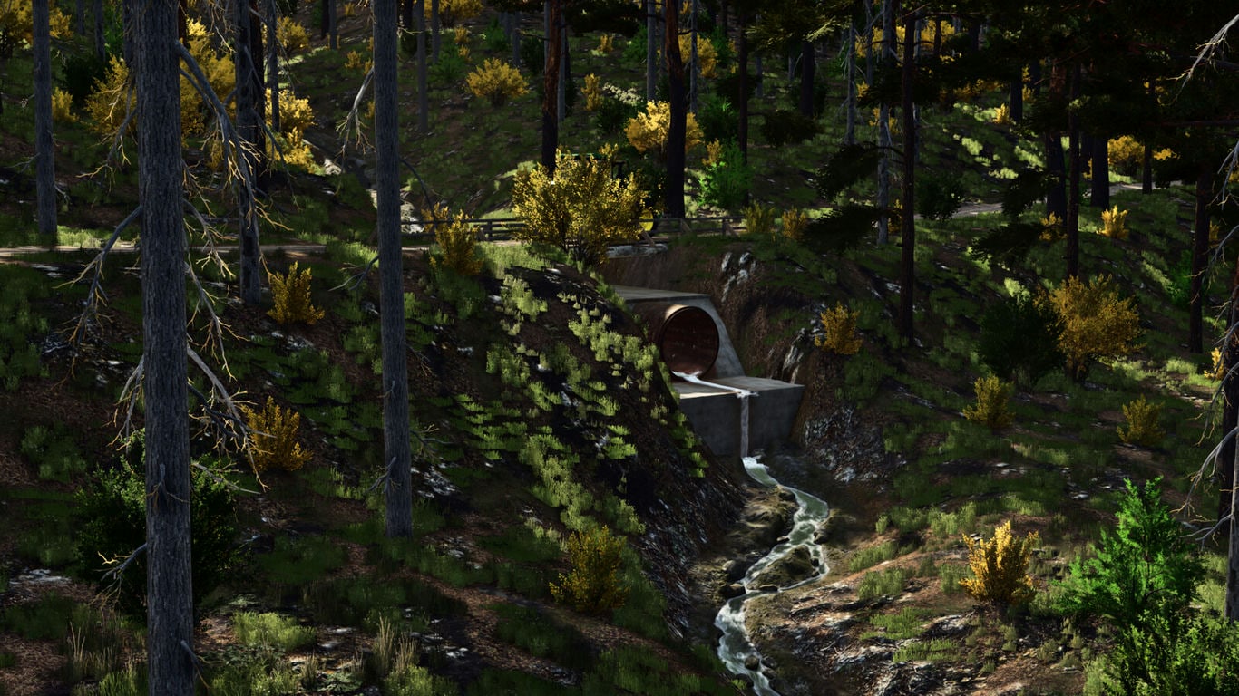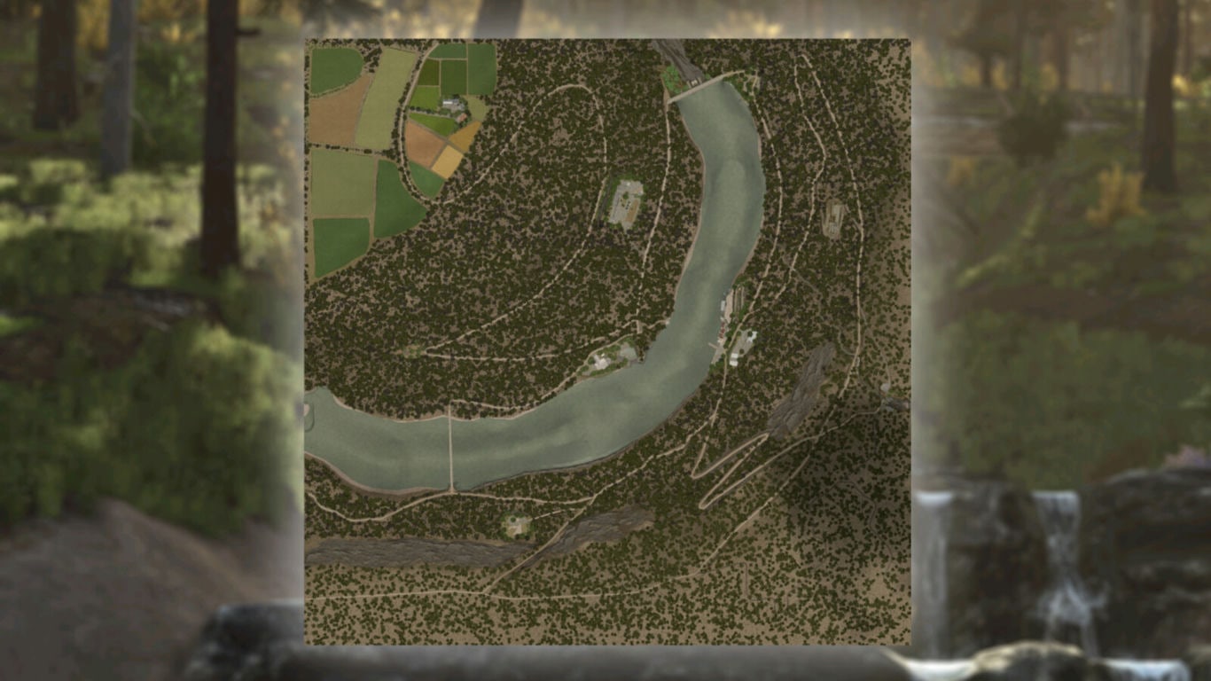 A detailed landscape with rivers, forest trails and winding roads for transporting timber.