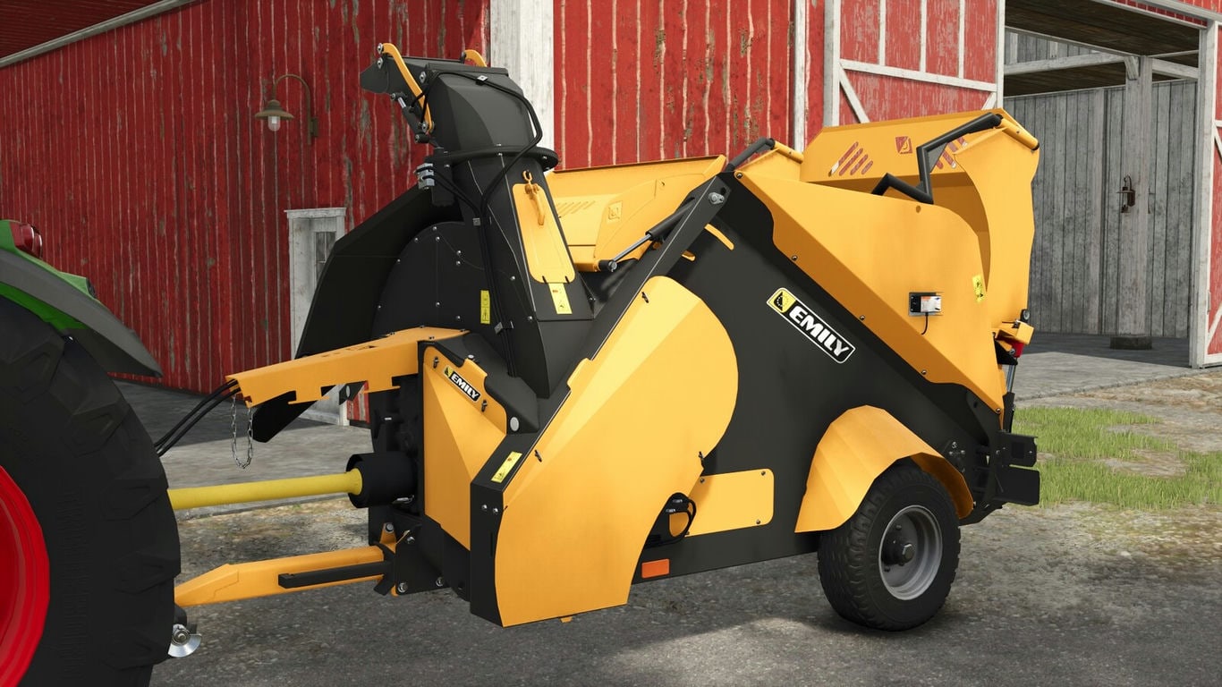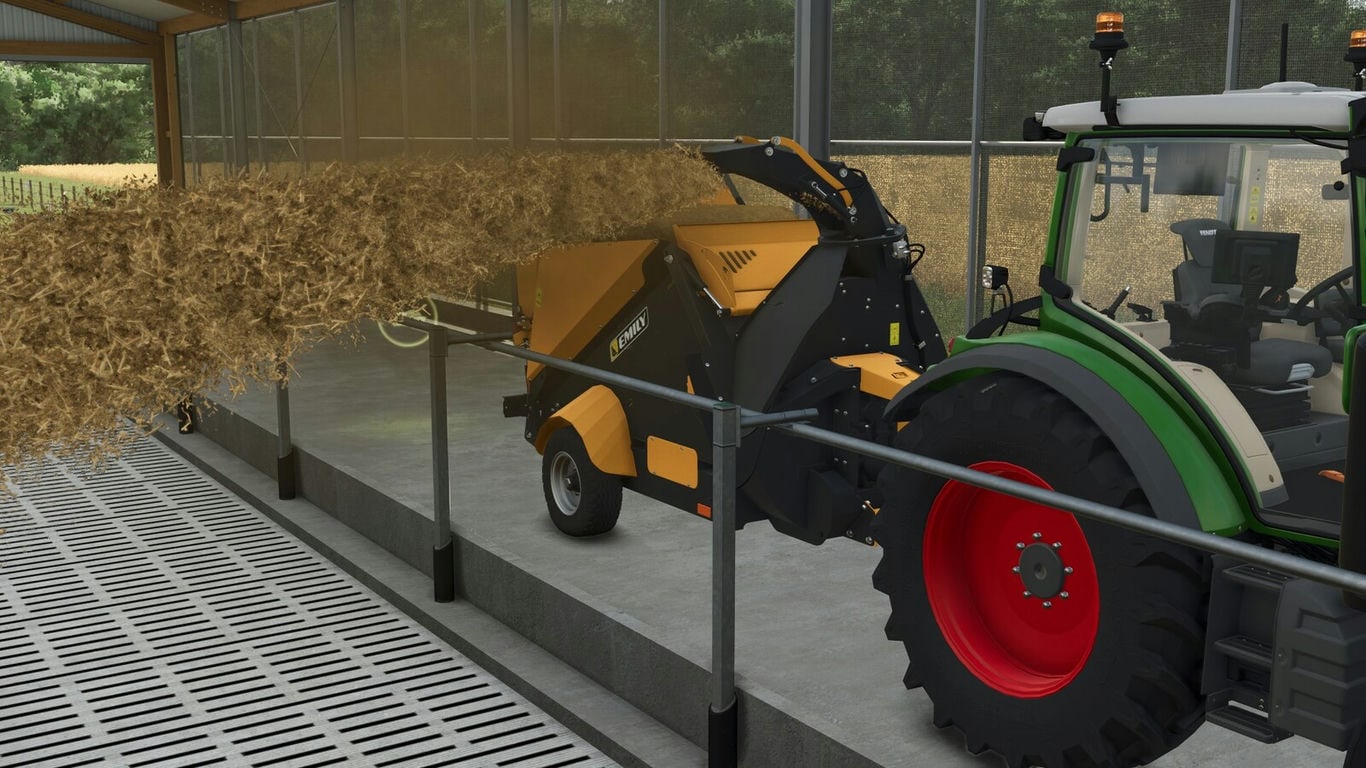 The Emily Vortex trailed straw blower ensures uniform and high-quality litter distribution thanks to its high-performance turbine. It can handle two round bales and guarantees fast and uniform distribution in any livestock facility. - Category: Straw Blowers Credits: Univers Simu Modding |