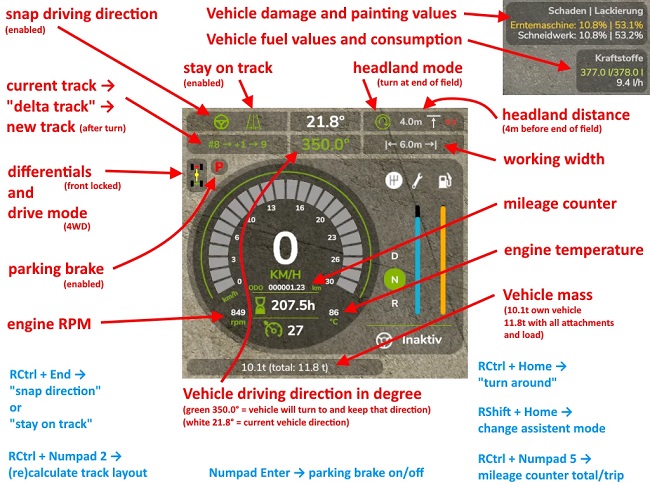 This is an Enhanced Vehicle modification for Farming Simulator 25. It adds a "track assistant" ("GPS") and a "direction reference" function, parking brake, differential lock, all-wheel drive modes and improved hydraulic control for your vehicle. It also shows more information about the vehicle on the HUD, including the odometer/distance meter.