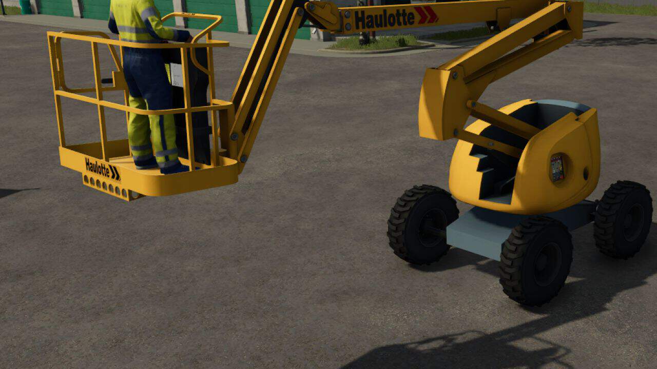 Self-propelled Haulotte tower for FS25. - Working height (m): 16 - Platform height (m): 14 (operator's feet) - Horizontal reach (m): 9.20 (from the platform axis) - Tilt of the controller: 5 degrees - Folded height (m): 2.20 I Width: 2.30 I Length: 6.95 - Basket load capacity (kg): 250 - Total weight (kg): 6950 - Tank capacity (L): 65