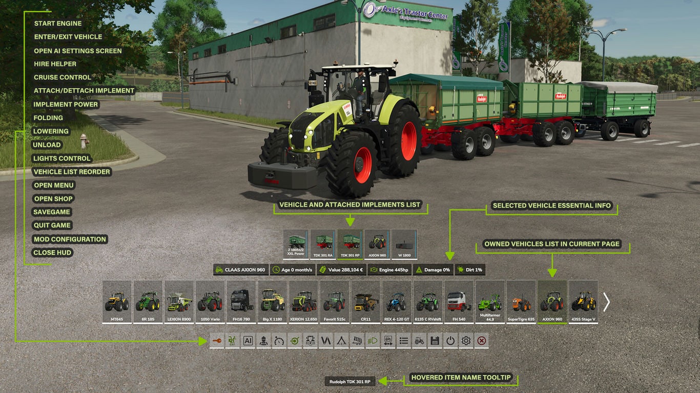 - Selectable vehicles: a page-by-page list of your own vehicles and attached attachments
