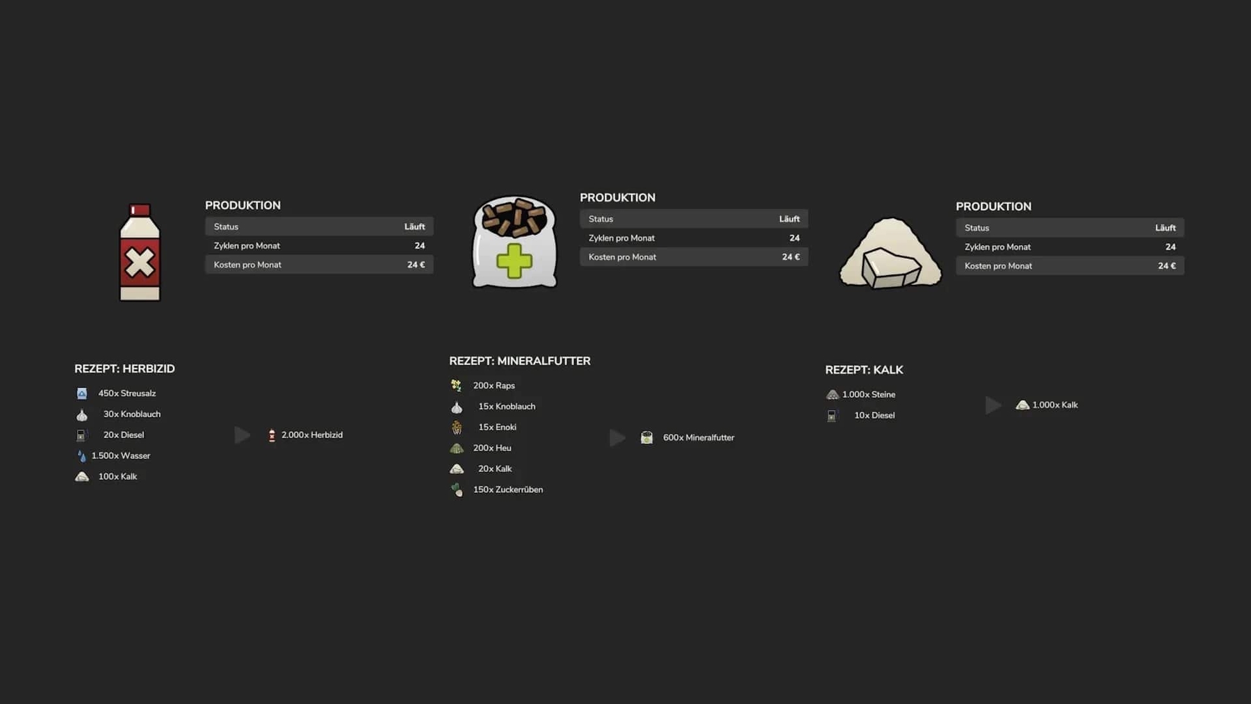Lime, mineral fertilizers, liquid fertilizers, seeds, herbicides and mineral feeds can be produced here.