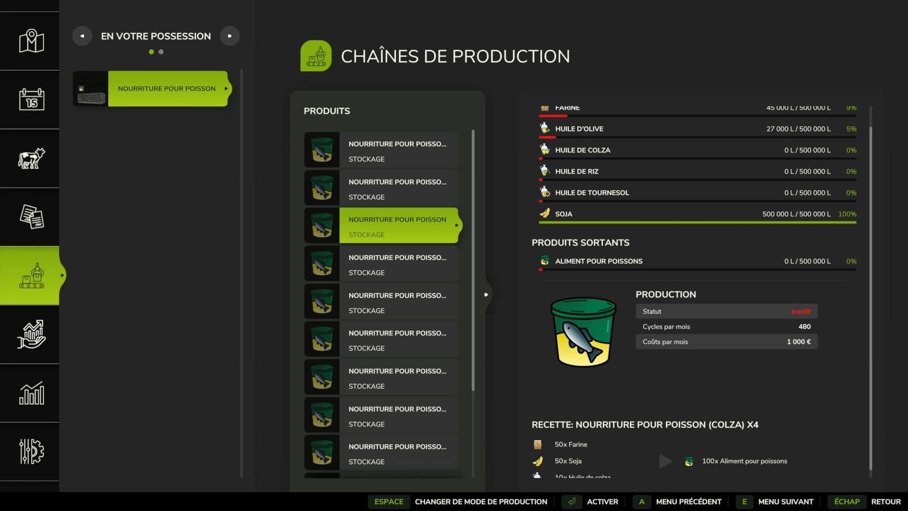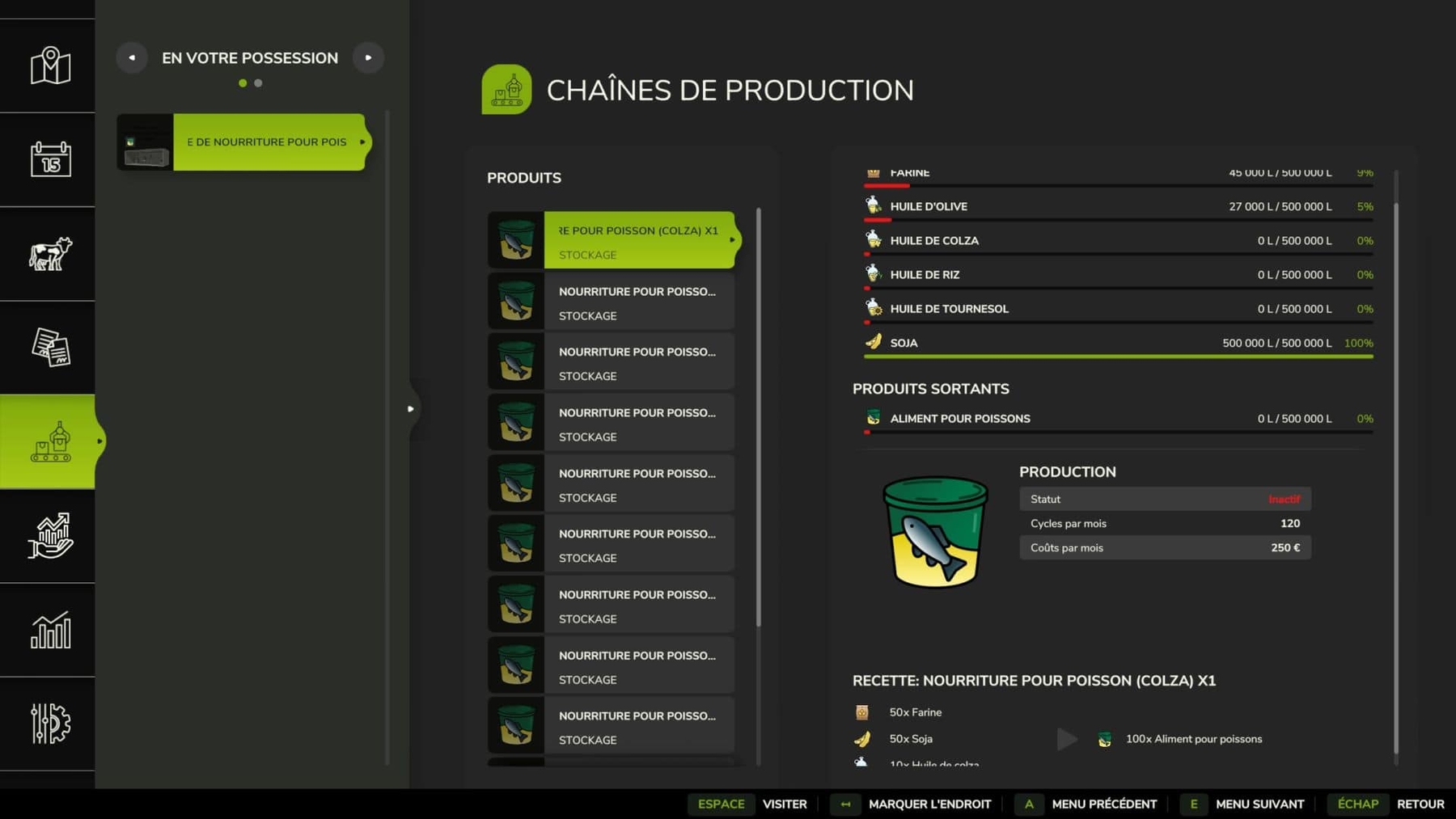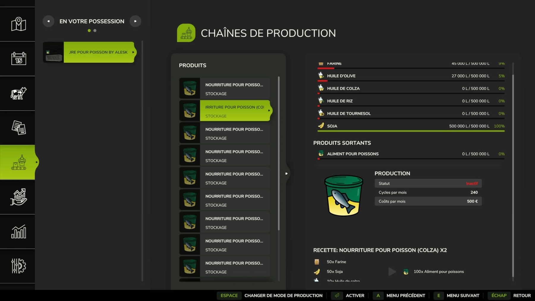 Fish food factory, based on a .i3d from the game and the base recipe. – 50 flour / 50 soy / 10 olive oil = 100 fish food – Speed x1: 120 cycles per month, 250€ production cost – Incoming storage: 300,000l – Factory price: €125,000 Credits: Alesk |