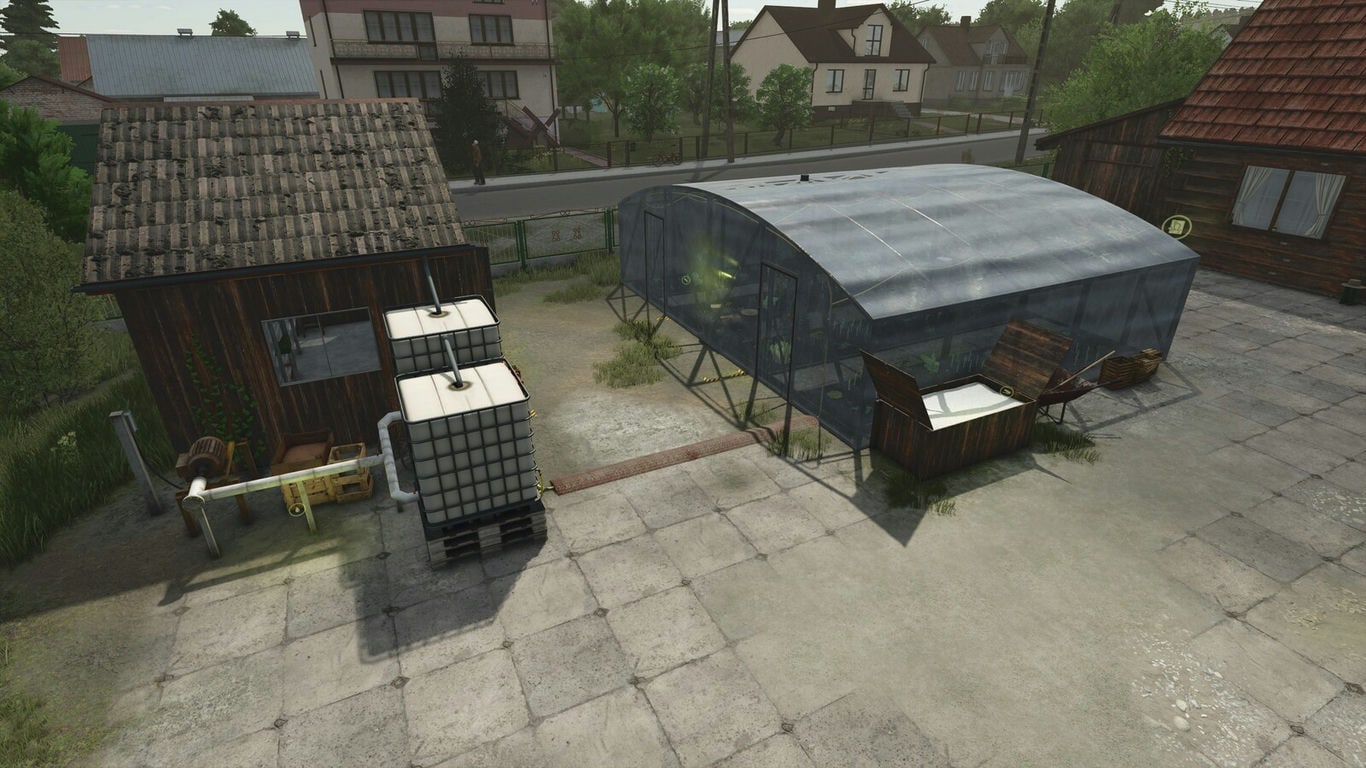 A small vegetable "factory" designed for realistic and small farms. Every production recipe now requires manure or solid fertilizer as an additional resource. Since manure is relatively easier to extract, production using manure is slightly slower than using solid fertilizer (about 15-20% higher productivity when using solid fertilizer). There is a warehouse next to the greenhouse where the boxes produced are automatically stored. In addition, during the rain, rainwater collected from the roof of the warehouse is directed directly into the water tanks. The parameters that determine the water collection rate can be configured in the script file.: Specifications: Credits: letmecook |