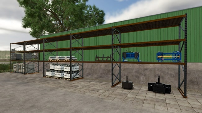 Heavy-duty shelves for storing/parking pallets such as seeds or film, as well as parking fixtures for telehandlers or front loaders. Credits: ELD |