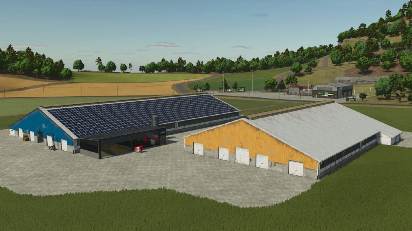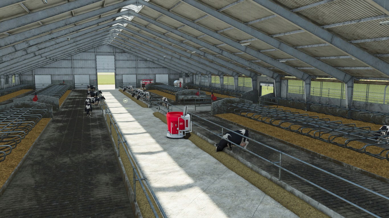 Cowsheds with small external pastures. 2 size options, both options with a feeding robot and without a pasture. There are a total of 8 placeable objects in the set.