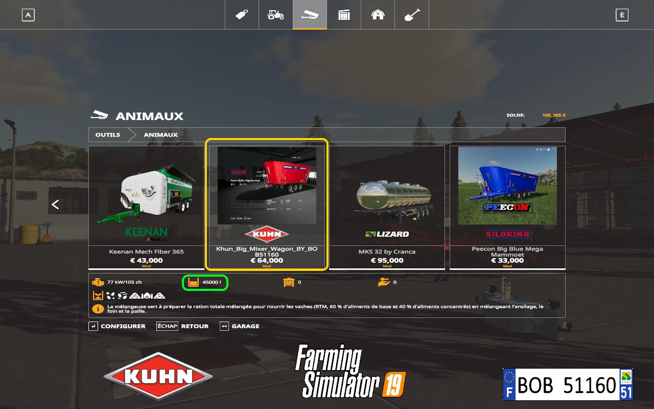 KHUN Big Mixer Wagon .... CAPACITY: 45,000 l. The required power of 105 hp, the price of 64,000 euros. Credits: BOB51160 / MAX51160 |
