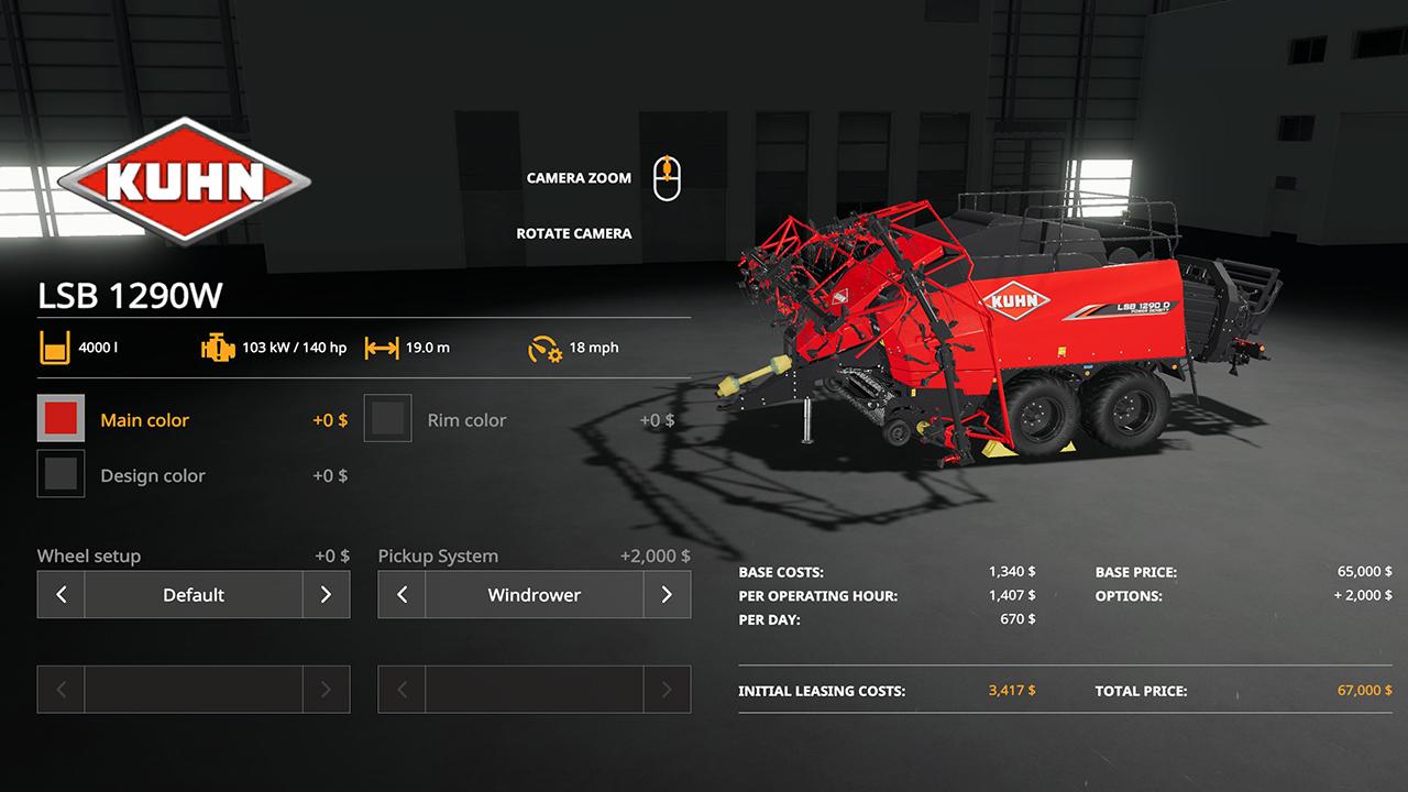 Kuhn LSB 1290 with added features. Main and secondary color selection: $200 Wheels color selection: $100 Base: No windrower $65,000 Work width: 2.75M Windrower: $2,000 Work width: 19M Work speed: 18mph