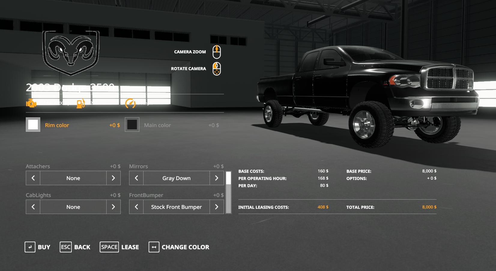 Mod 2003 Dodge 3500 v1.0 for Farming Simulator 2019 Power 300 hp, max. speed 120 km / h, price 8000 euros, configurations, lighting, two types of engine, color choice. Credits: McLain Modding |