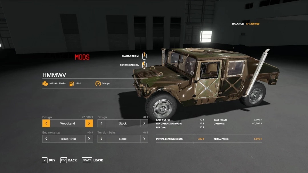 Mod HMMWV v1.0.0.0 for Farming Simulator 2019 Functions: Multiple skins Tension belts Choice of design Removable top Radio and new 3d models