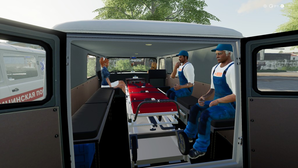 MOD UAZ 3741 AMBULANCE V1.0.0.0 FOR FARMING SIMULATOR 2019 Authors of the Original werik, Silak_68, Shippy74, Koral, IDimm, 4X4, Arseniy 1998, - = FaRMeR = / LS17 by *** ADOLF *** The author of the envelope and rework FS19: Gwailo - Power: 83 kW / 113 hp; - Added speed: 100 km / h; - Simple IC is present. The gurney movement opens the doors; - Simple IC is present. The choice of a patient on a gurney 4 options, depending on the patient, the gurney can be expanded under him - Added side lights on the roof; - Added Seats in the salon; - Added Med staff you can choose without them; - Added Universal Passenger 2 Players; - Added Gurney Animated; - Added stickers;