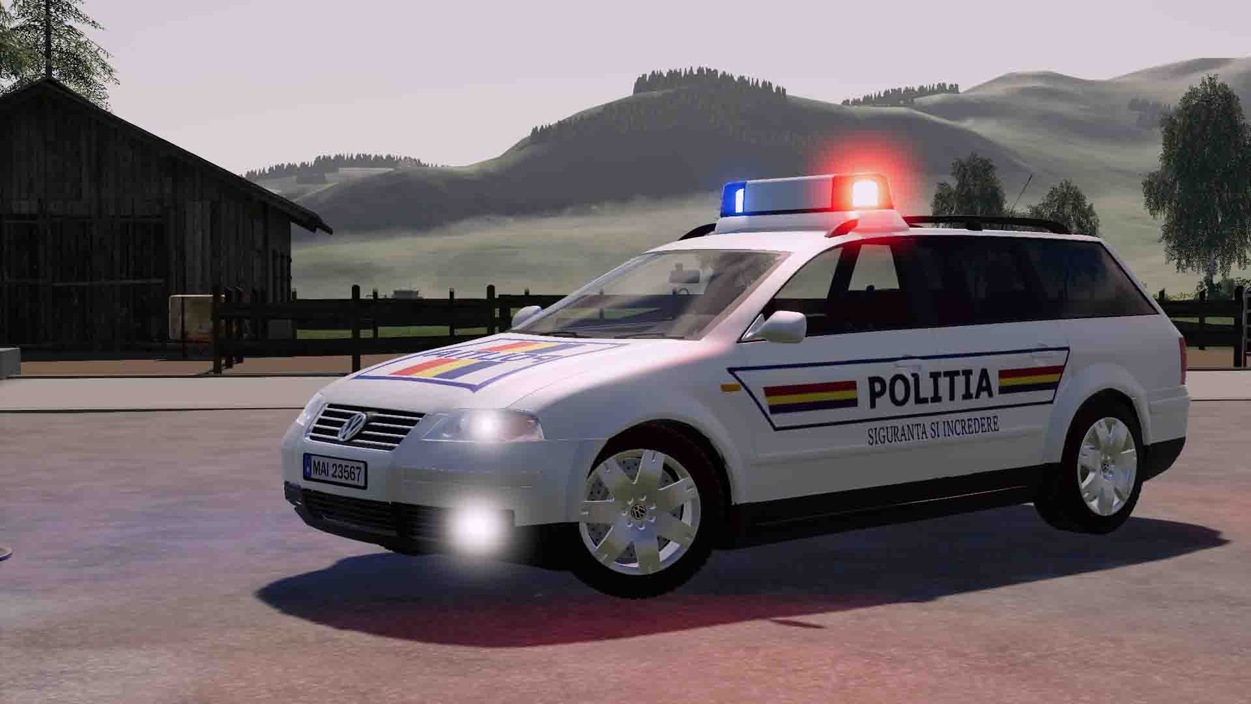 MOD VOLKSWAGEN PASSAT POLITIA V1.0.0.0 FOR FARMING SIMULATOR 2019 - Power: 51 kW / 70 hp; - Speed: 220 km / h; - Fuel tank volume: 60 liters; - Cost: 36 990 €; - Engine selection; - Animated devices; - Working lighting equipment; - Working mirrors; - Leaves wheel marks.