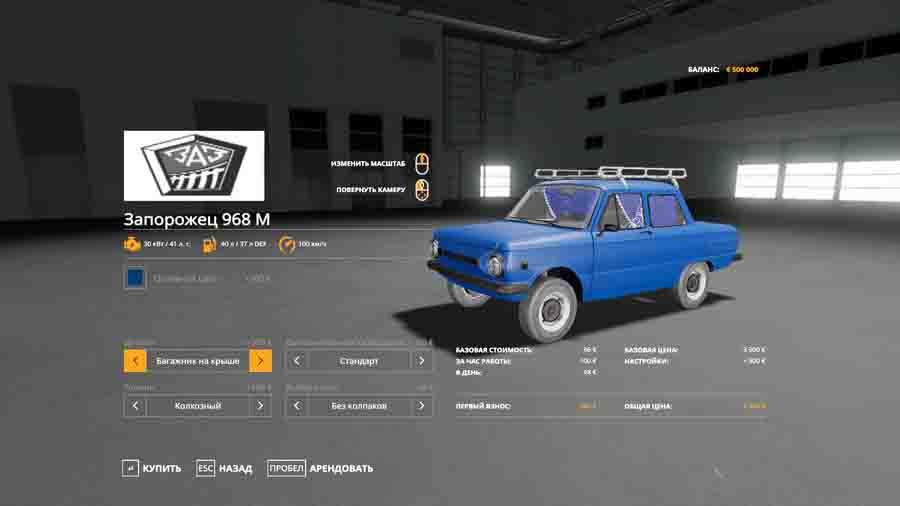 Mod ZAZ-968M V1.0 for Farming Simulator 2019 Conversion from the 17th version of the game. With improvements. There are: - Color selection - Tuning - Wheels Illumination and animation of the dashboard. Cooling fan animation. Dust, dirt, traces. Credits: Macedonsky |