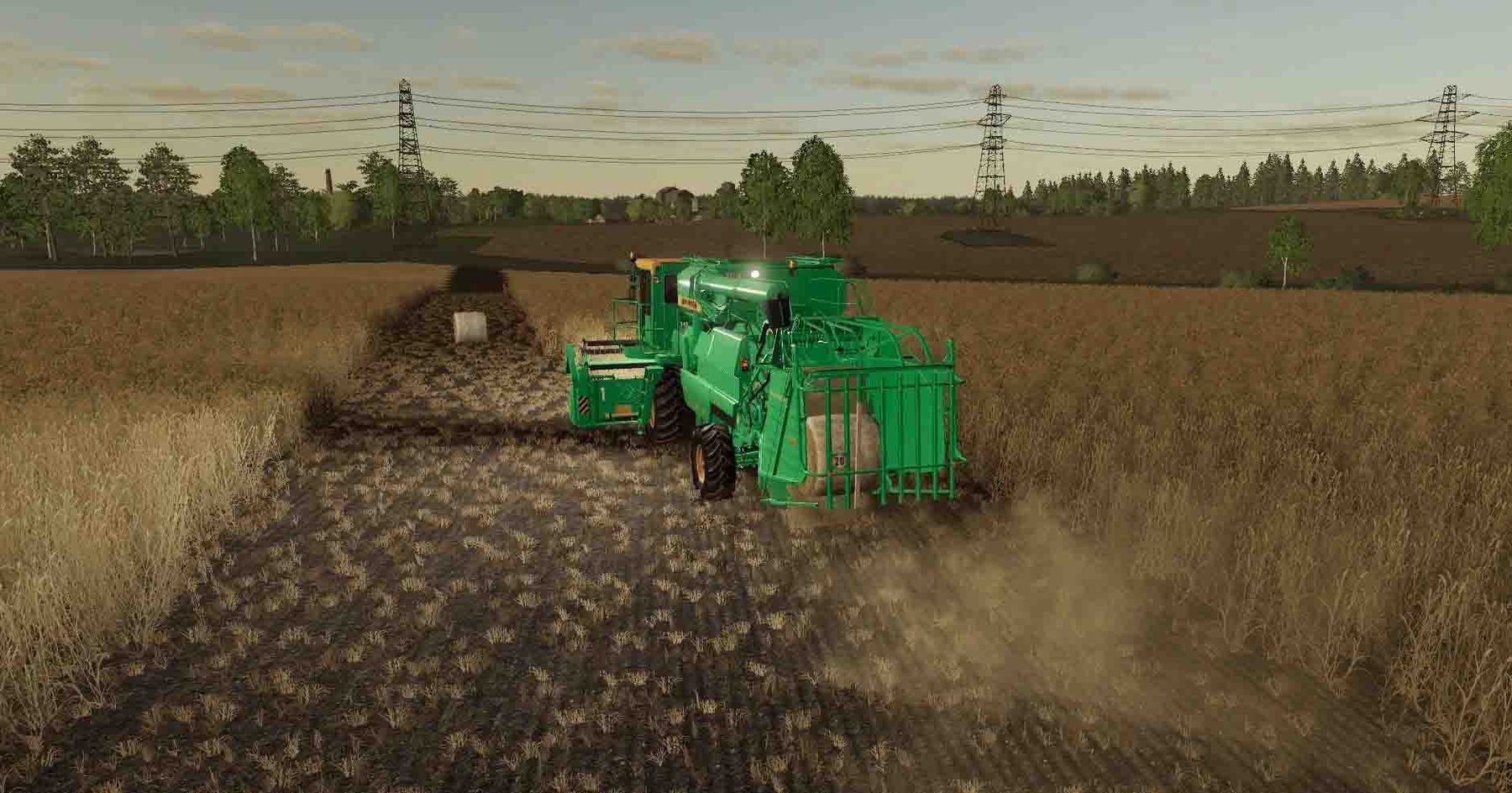 The harvester is equipped with three ZHU-6 headers; 7; 8.6, a header for harvesting sunflower and corn PSP-10 and a trolley for transporting headers, a choice of wheels, an unloading auger, shredders, a stacker, towing hitch devices, glass on the cab, a heater, two engines (YaMZ-238 and Cummins, when choosing an engine changed the hood and little things). The side flaps are removed. Added a straw bale function when selecting a stacker, only it works when there is no script to play on the track. |