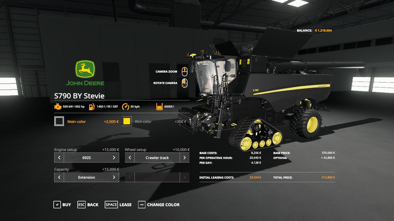 FS19 John Deere S790. Added color options for the body and wheels, including tracks, max max. speed and operating speed, 2 additional engine options, added additional tank sizes for cereals of 30,000 l and 60,000 l in the store, extra lighthouses, wider tracks and wheels, extra steering and faster unloading. Credits: Stevie |
