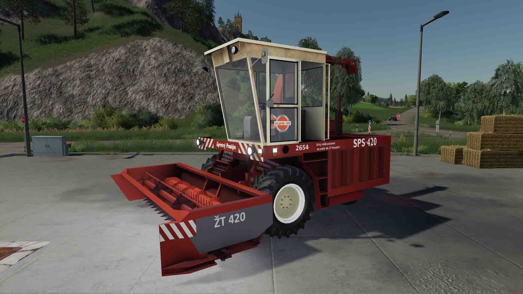 Mod SPS 420 PACK V1.0.0.1 for Farming Simulator 2019 - Power: 132 kW / 180 hp.; - Speed: 32 km / h; - The volume of the fuel tank: 370 l.; - Cost: 26 000 €; - The door opens; - Working lighting; - A working mirror; - Animated appliances; - leaves traces; - Includes 3 reapers and trailer for transporting reapers. Credits: Smety, Pavlas, Ada85, SDmotr |