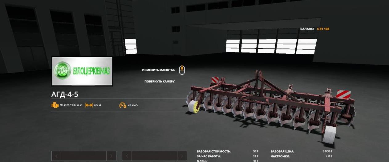 - Cost: 3 000 €; - Required power: 96 kW / 130 hp; - Working width: 4.5 m; - Working speed: 22 km / h.