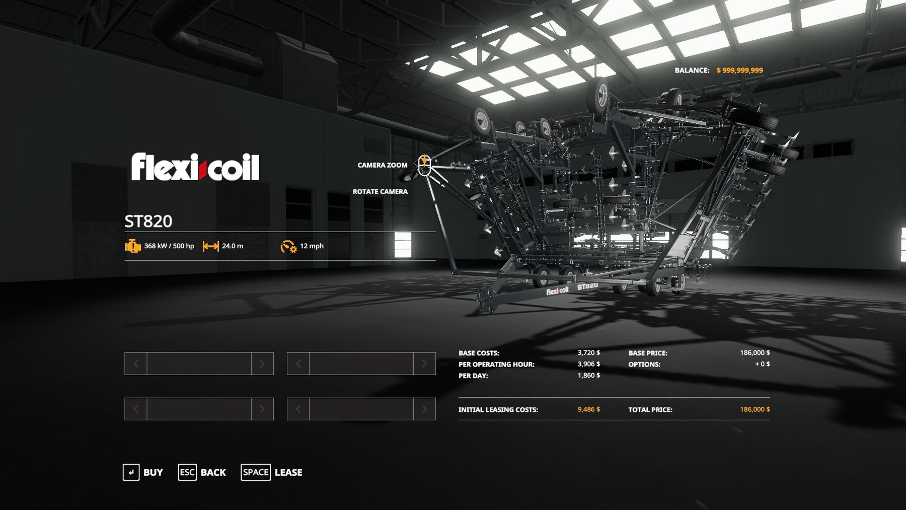Required power 500, working speed 12 km / h, working width 24.0 m, price 186000. Credits: Giants Software & Tinman |