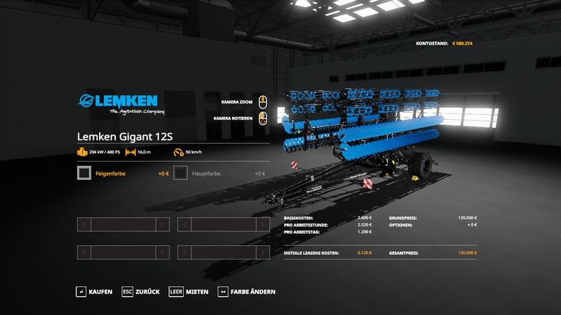 Mod Lemken Gigant 12S v1.4.0.0 for Farming Simulator 2019 Required power 400 HP Credits: schue |