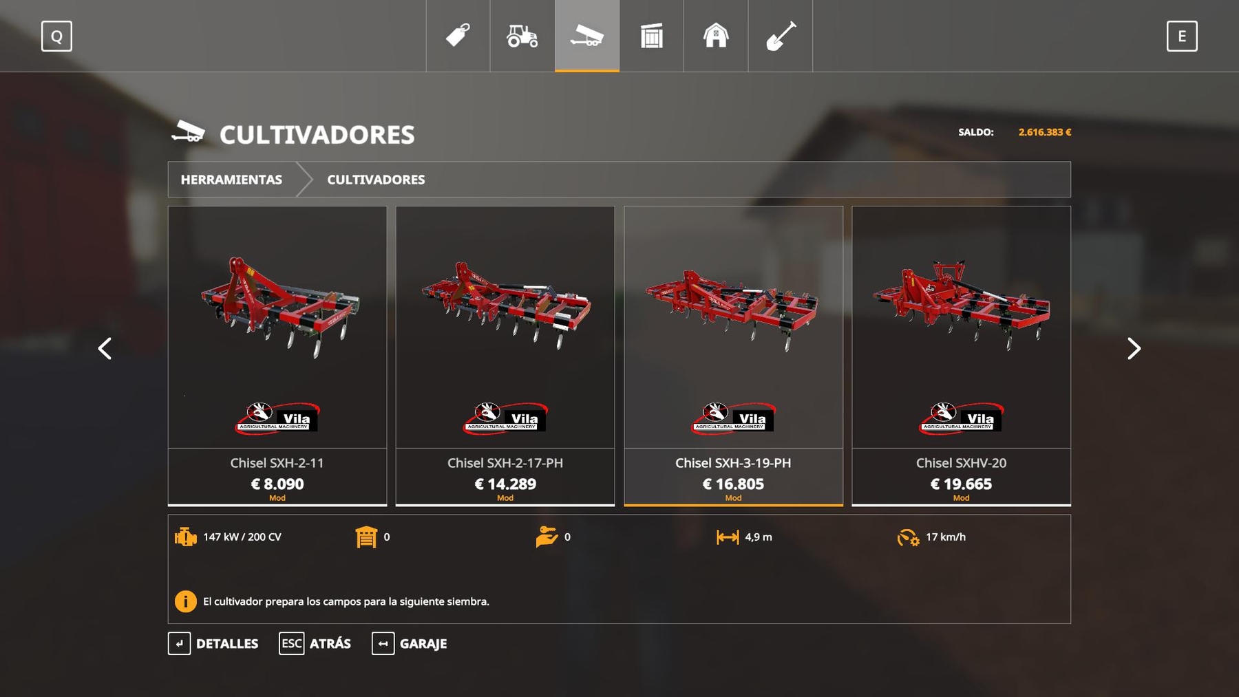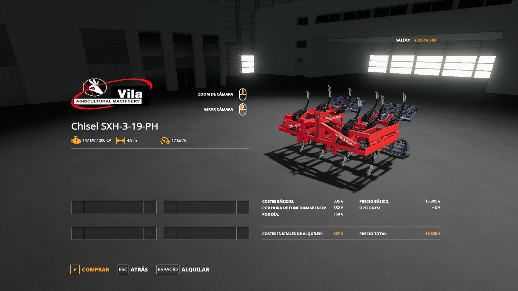 Mod Vila Chisel SXH 3 19 PH v1.0.0.0 for Farming Simulator 2019 Vila cultivator with 19 levers in three rows, with a roller with a working width of 4.9 meters, the required power of 200 hp, working speed of 17 km / h, price 16805 euros. Credits: JavierZzs, Toymatao |