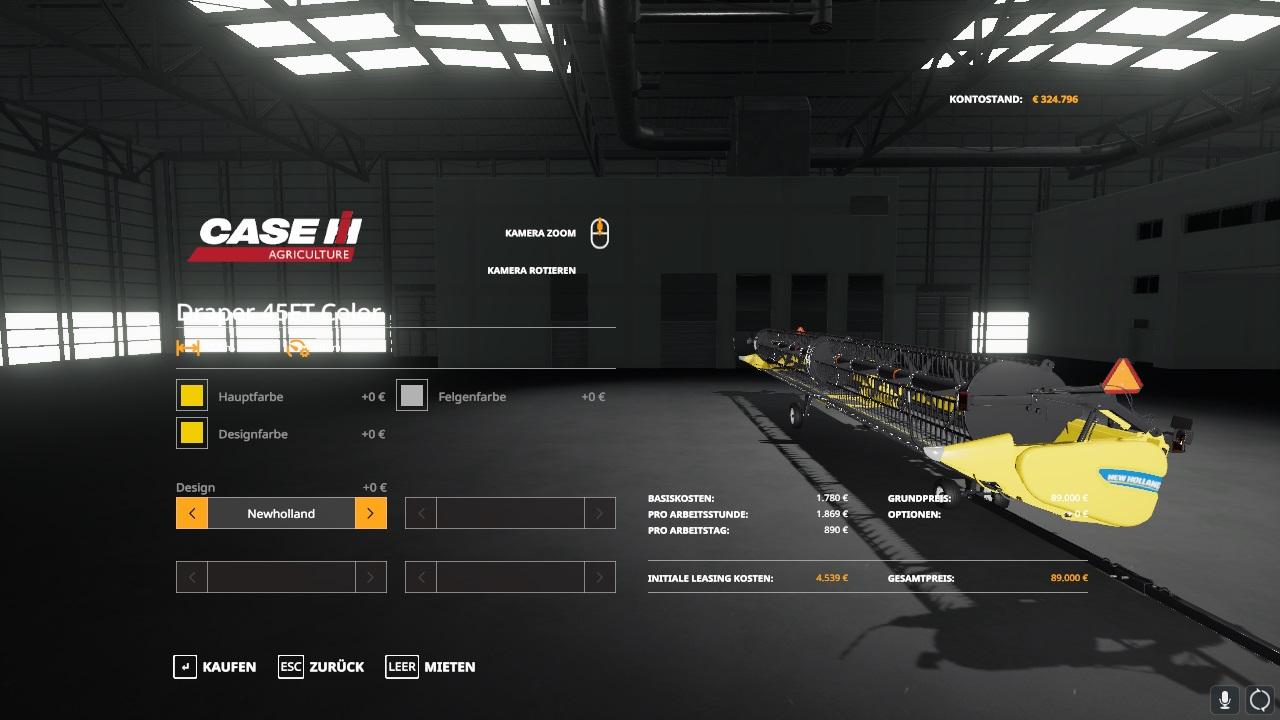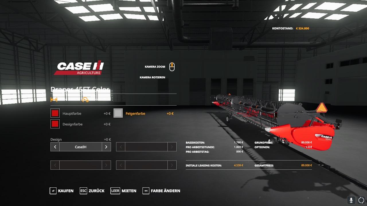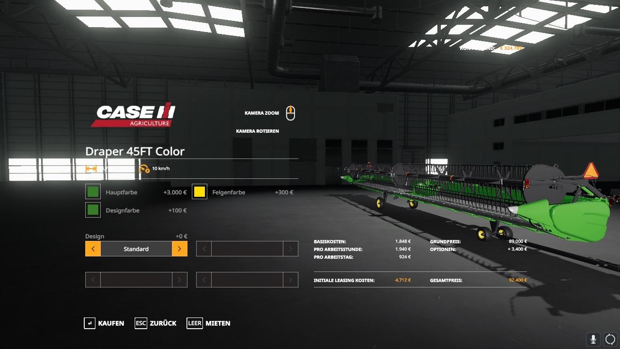 Here's Case's 45FT (13.7m) Draper header with color choices for the header and wheels. Furthermore, it has a design config for the decals of Case, New Holland or without. Credits: Landwirtschaftssimulator |