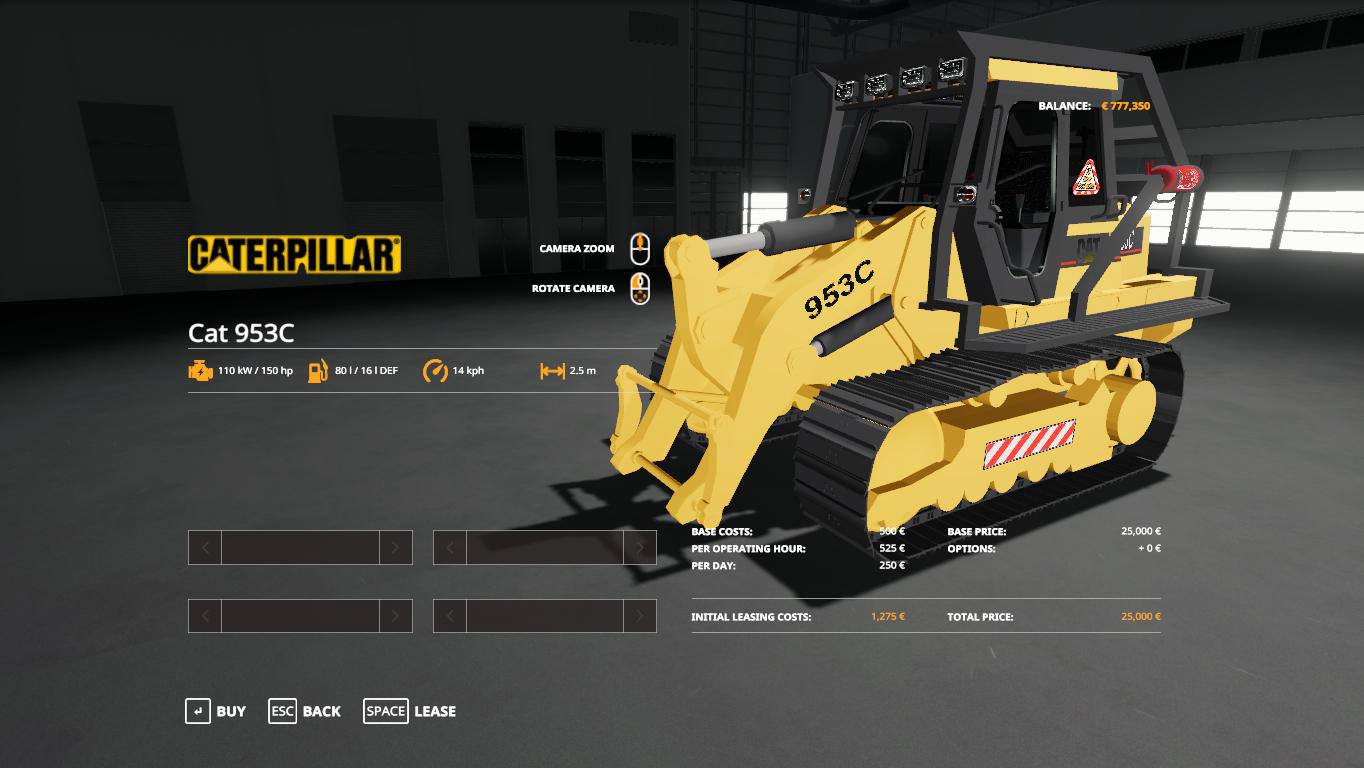 MOD CAT 953C CRAWLER LOADER V1.0.0.0 FOR FARMING SIMULATOR 2019 Power: 150 l / s, speed: 13 km / h. Bucket: 6500 HP Trailed, lighting, beacon.