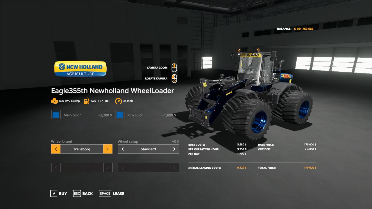 MOD EAGLE355TH NEW HOLLAND WHEELLOADER V1.0 FOR FARMING SIMULATOR 2019 Power 824 hp, mask speed 45 km / h, gets dirty and washed. The log is clean. Credits: EAGLE355TH |