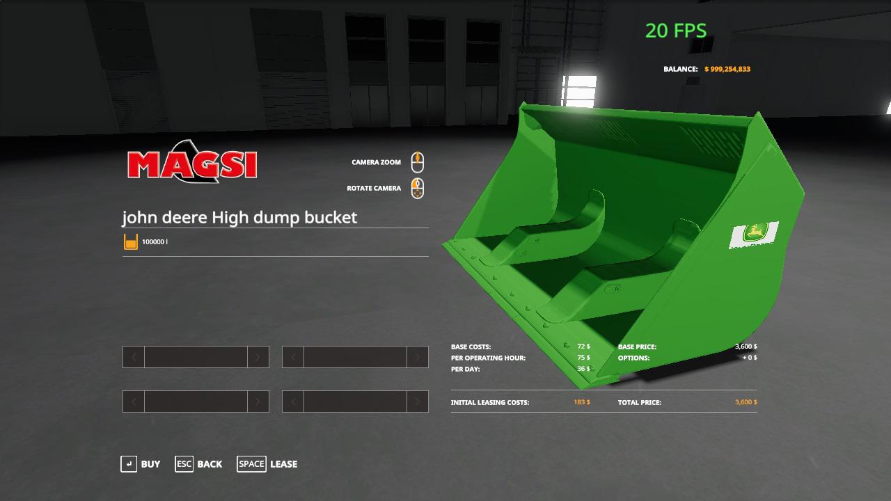 Mod John Deere loader bucket v2.0 for Farming Simulator 2019 This bucket can hold 100,000 liters. Unloads 20,000 liters per second. The cost is 3600, and for rent - 183. Updates to V2 Credits: adub modding |