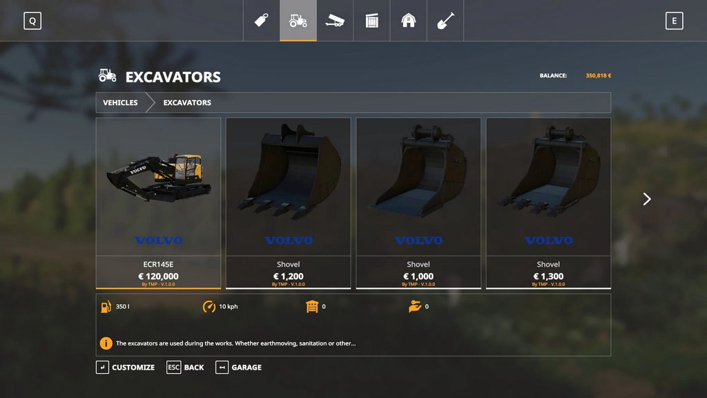 Volvo EC 145 hydraulic excavator with a small turning radius for working in a confined space for Farming Simulator 2019. Comes with a set of buckets suitable for him. Specifications: Credits: TMP/Polygonish |
