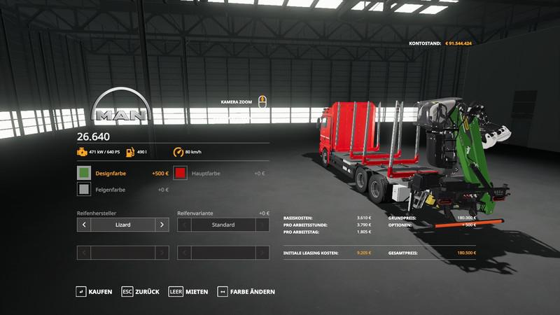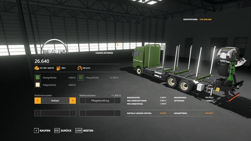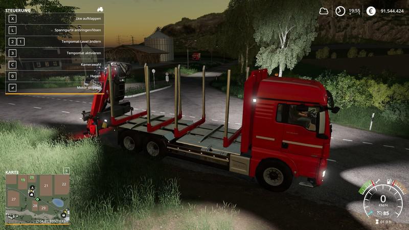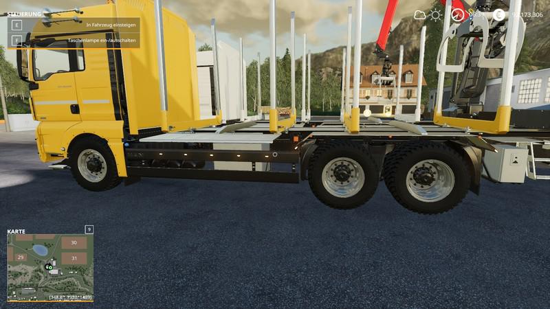 MAN truck for transporting logs. With a choice of colors, two types of tires and wheels, side lights, updated shine. Power 640, max. speed 80. The mirrors are adjusted, three lights are installed to see more in the dark when loading, with the headlamp to which the light is added, when folding the crane and unfolding the crane, the time has changed, so now it is faster. Single player entry and error-free multiplayer Credits: Forst_Meister |